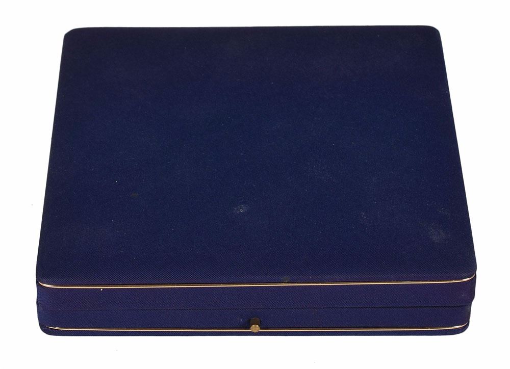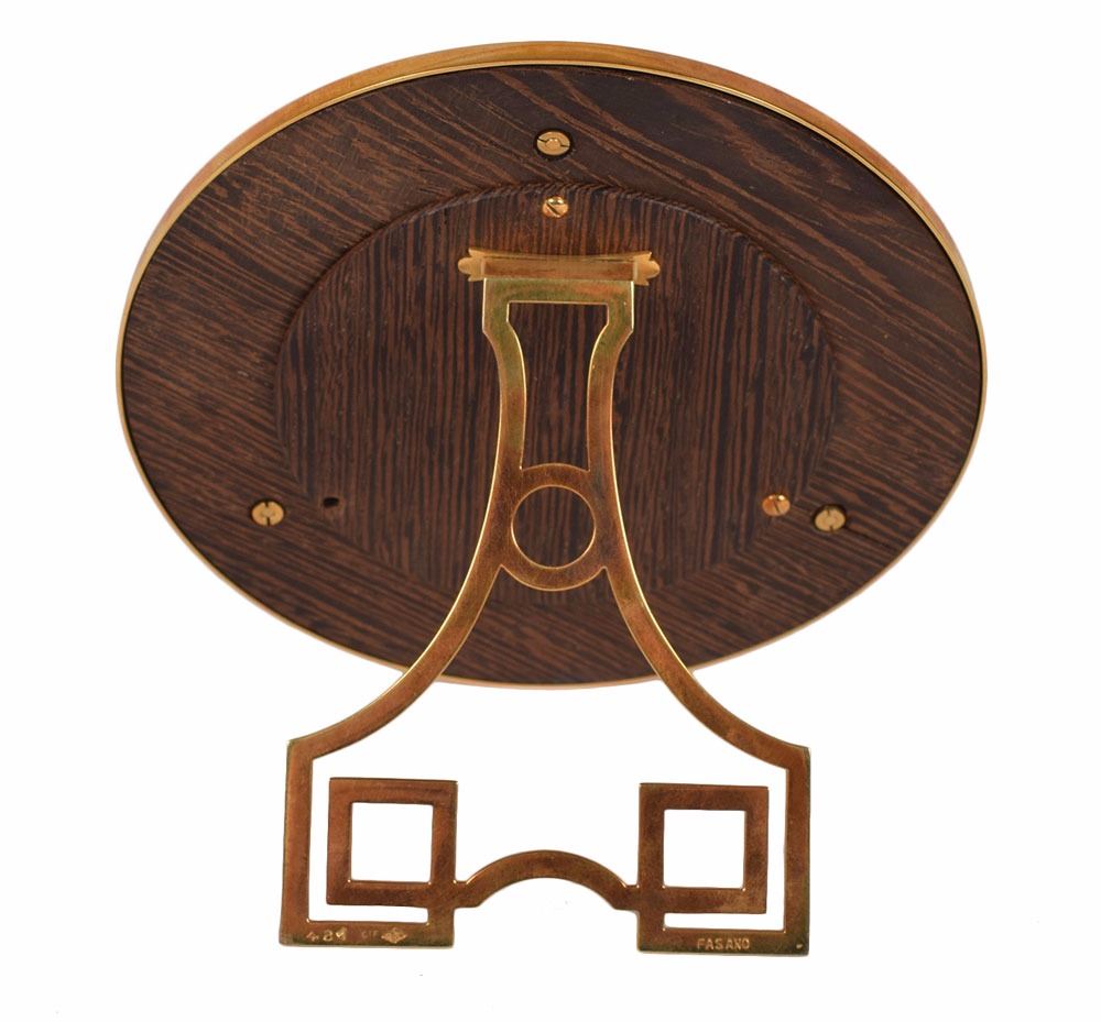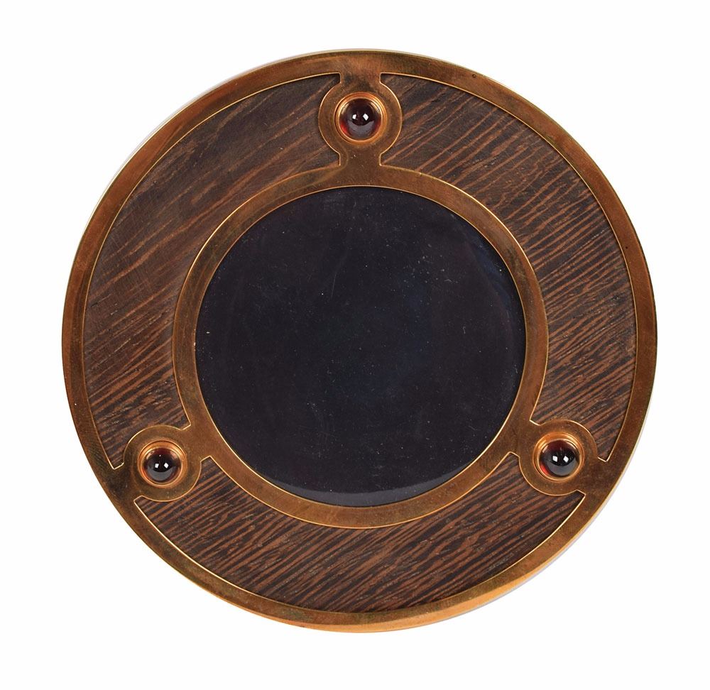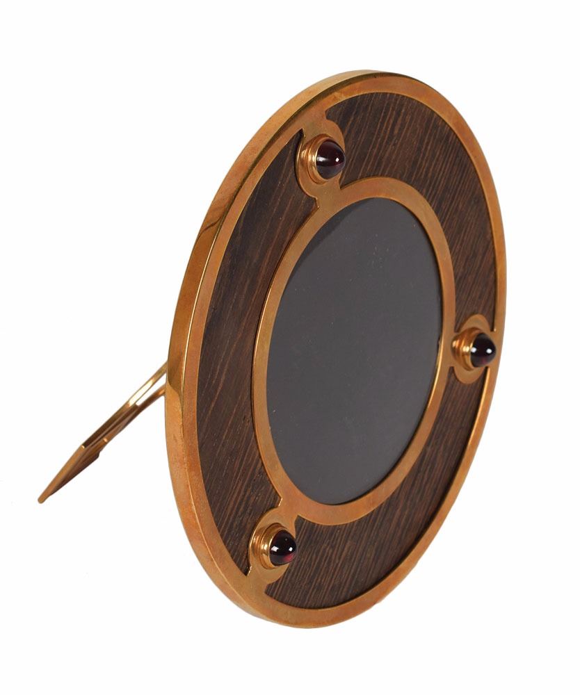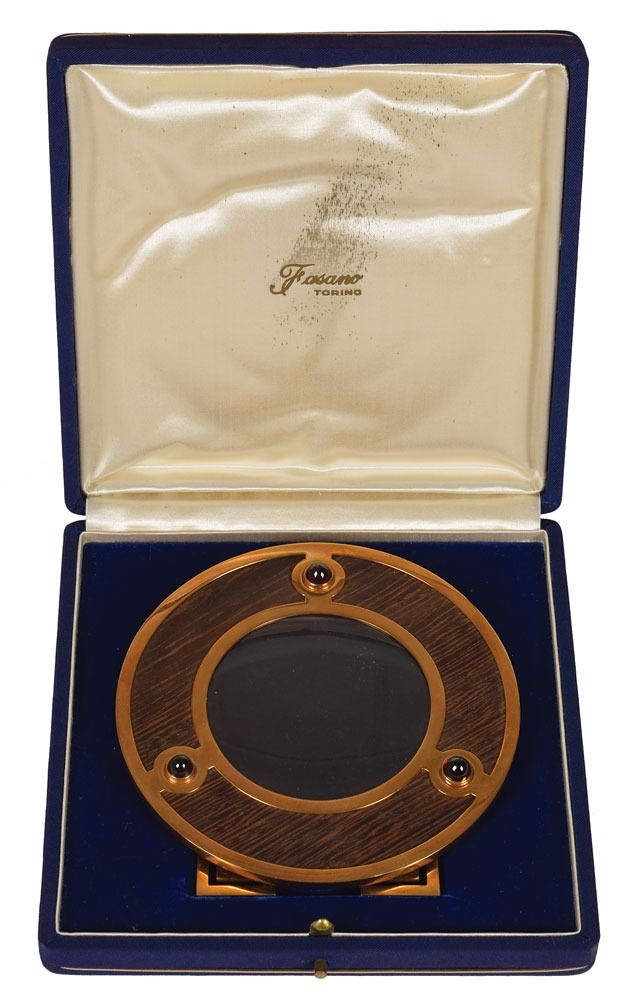 John F. Kennedy's personally-owned gold-tone and dark wood round stand-up picture frame by Fasano of Torino, Italy, measuring 4.25? in diameter, featuring three inset red 'ruby' gemstones around the perimeter. Accompanied by a typed provenance statement attributed to Evelyn Lincoln, in part: "This small gold, round, stand-up picture frame…was given to President John F. Kennedy by a very dear friend of his, when he visited Italy in 1961. He brought this gift back to the States in his luggage and then placed it in his desk in the Oval Office, where it stayed until it's removal on November 23, 1963." Includes the original Fasano presentation case. In fine condition, with one missing screw from the back. Provenance: Documents and Artifacts Relating to the Life and Career of John F. Kennedy, Guernsey's, March 1998.