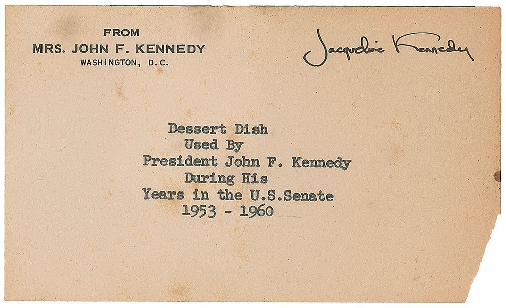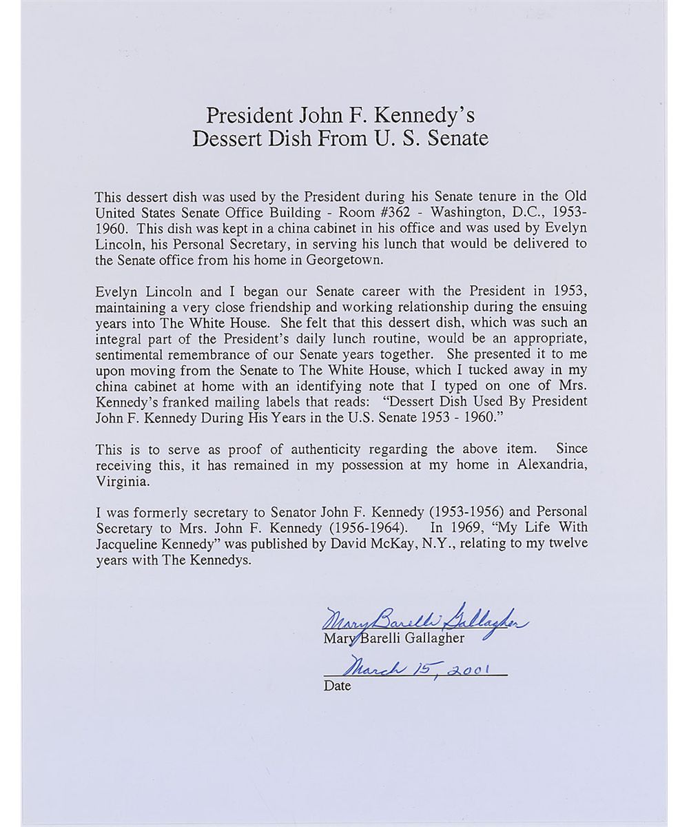 Kennedy’s personally-owned and -used porcelain luncheon dish from his tenure in the Senate, 6? in diameter, decorated with a floral design in the center and gilted with 22-karat gold around the rim. This dish was kept in a china cabinet in Kennedy’s office and was used by his secretary, Evelyn Lincoln, in preparing his lunch. In fine condition. Accompanied by a letter of authenticity from Jacqueline Kennedy’s personal secretary, Mary B. Gallagher, in part: “Evelyn Lincoln and I began our career with the President in 1953, maintaining a very close friendship and working relationship...She felt that this dessert dish, which was such an integral part of the President’s daily lunch routine, would be an appropriate, sentimental remembrance of our Senate years together. She presented it to me upon moving from the Senate to The White House, which I tucked away in my china cabinet at home with an identifying note I typed on one of Mrs. Kennedy’s franked mailing labels.” Includes the typed identification note mentioned in the letter. Kennedy was a light eater and known to prefer a lunch of soup, a sandwich, and fruit. An uncommon item that was actually used by the senator and future president.