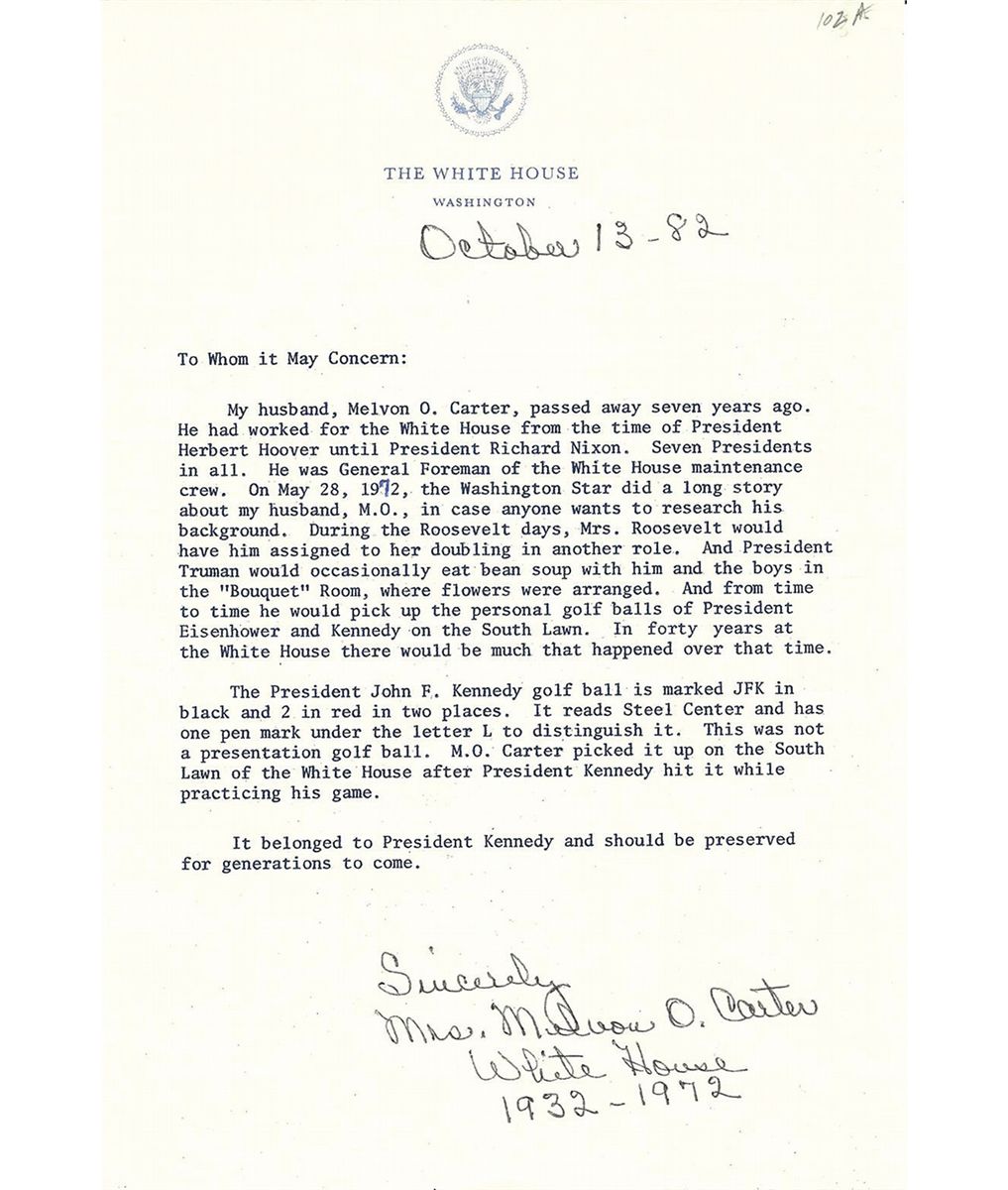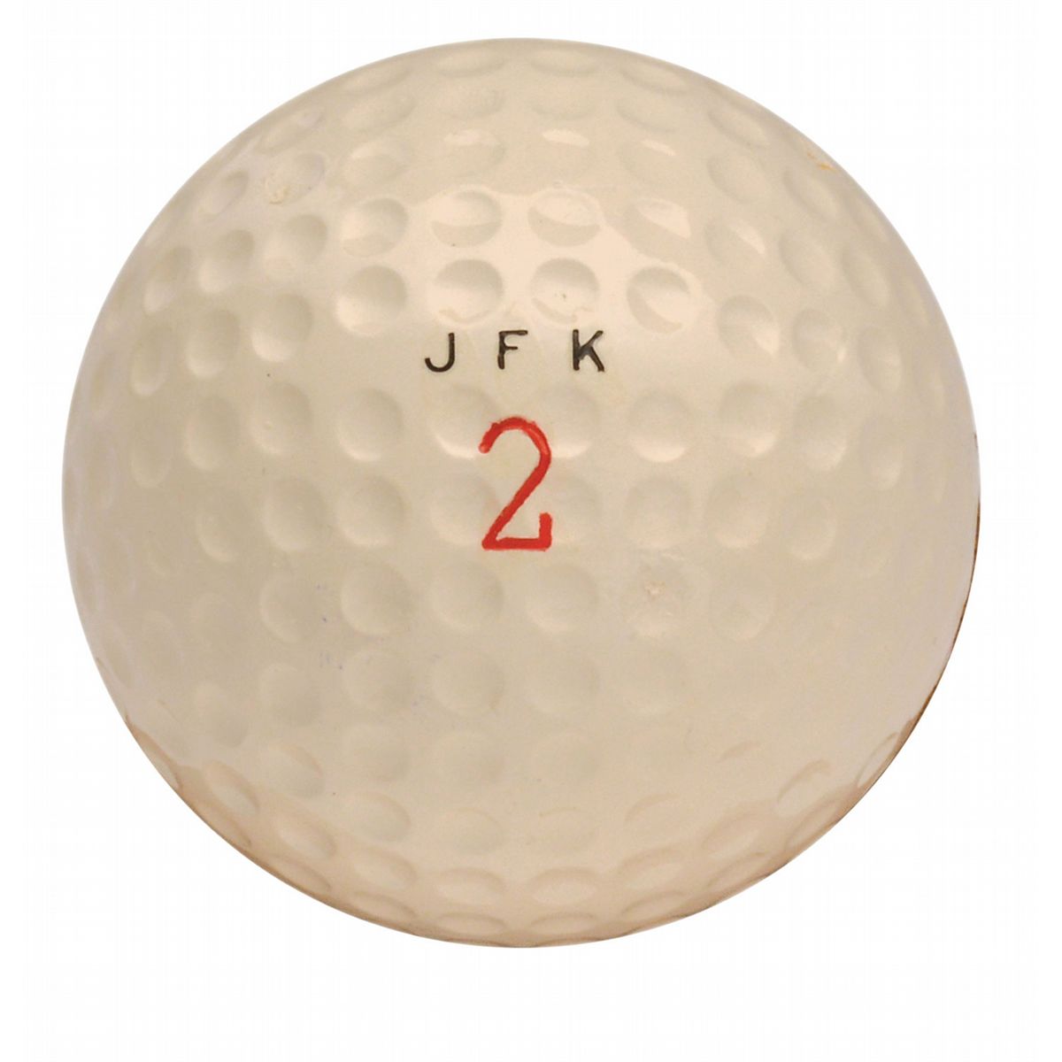 Kennedy’s personally-owned golf ball, embossed in red and black in two places, “J. F. K.,” circa 1962, picked up from the South Lawn of the White House, where Kennedy practiced from time to time, and retrieved by White House General Foreman Melvon O. Carter. Accompanied by an October 13, 1982 letter of provenance from Carter’s widow, written on White House stationery, which reads, in part: “My husband, Melvon O. Carter…had worked for The White House from the time of President Herbert Hoover until President Richard Nixon…he would often pick up the personal golf balls of President Eisenhower, and later, President Kennedy, from the South Lawn of the White House. This President John F. Kennedy golf ball is marked JFK in black and 2 in red in two places. It reads, Steel Center and has one pen mark under the letter L to distinguish it. This was not a presentation golf ball. M. O. Carter picked up the golf ball after President Kennedy hit it while practicing his game.” In fine condition. Provenance: The Raleigh DeGeer Amyx Collection.