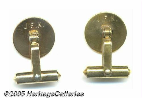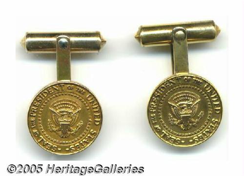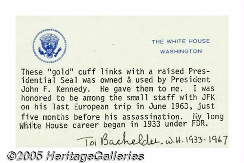 <B>John F. Kennedy's Presidential Seal Cuff-links</B></I> Toi Bachelder joined the White House staff following the inauguration of President Franklin Roosevelt in 1933 and continued working there for Presidents Truman, Eisenhower, Kennedy and Johnson before retiring in 1967. Lyndon Johnson was so impressed with her service that her gave a private retirement party for her in the White House. John Kennedy presented Bachelder with his ornate set of gold cuff-links as a memento of his appreciation around the time of his last European trip in June 1963. Embossed with the Presidential Seal on the obverse, his initials are engraved on the reverse. A signed, engraved, White House card details the cuff-links and discusses her time with Kennedy. Lot:255