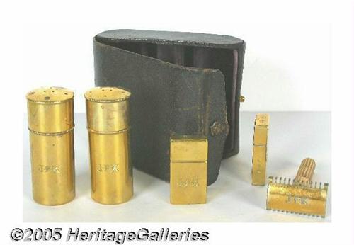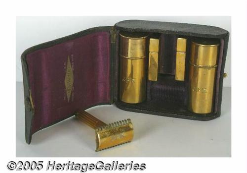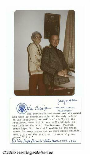 <B>John F. Kennedy's Shaving Set with Case</B></I> Each piece of this great brass shaving kit is hand-engraved, "JFK," and was owned and used by Kennedy while President. Lillian Rogers Parks obtained this magnificent set from White House Doorman Preston Bruce, who kept it following Kennedy's assassination. Parks served as a White House maid for thirty years from the days of Herbert Hoover to John F. Kennedy. She later wrote a book about her thirty years of White House service, entitled <I>My Thirty Years Backstairs at the White House,</B></I> which recounted the many Presidential families that she served. A signed, engraved, White House card with the history of the shaving set as well as her related memories is included. Makes a striking display piece with historic White House card, leather case and monogrammed pieces. Lot:255