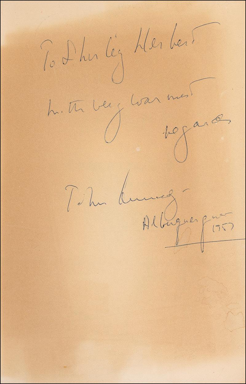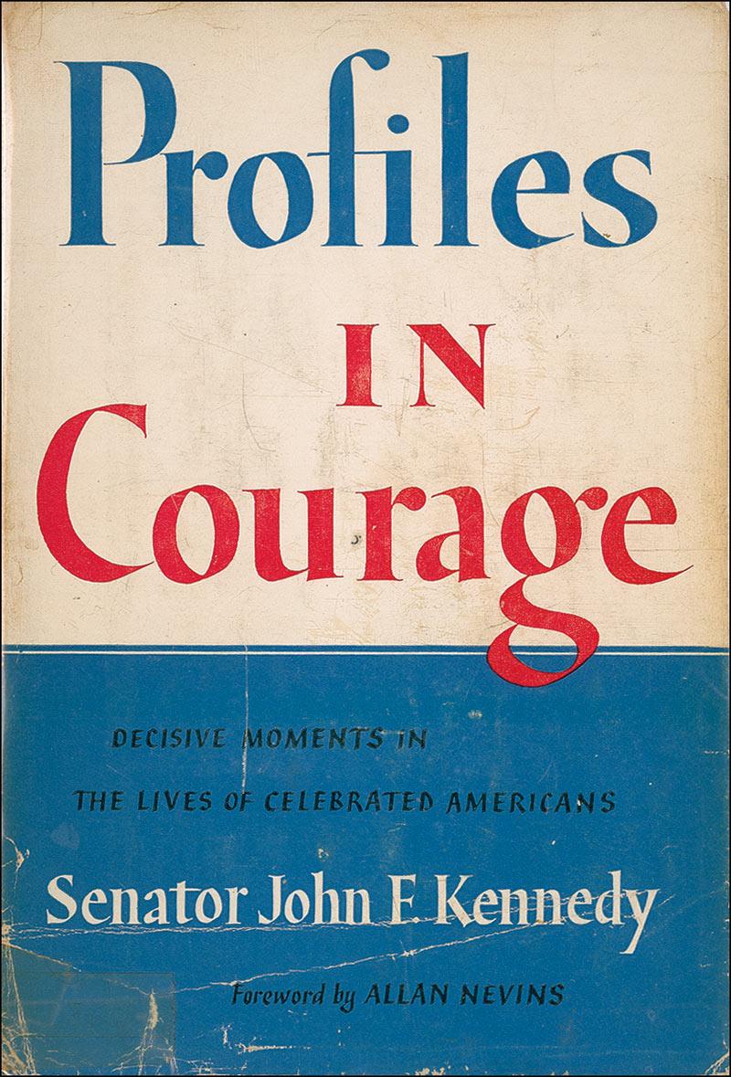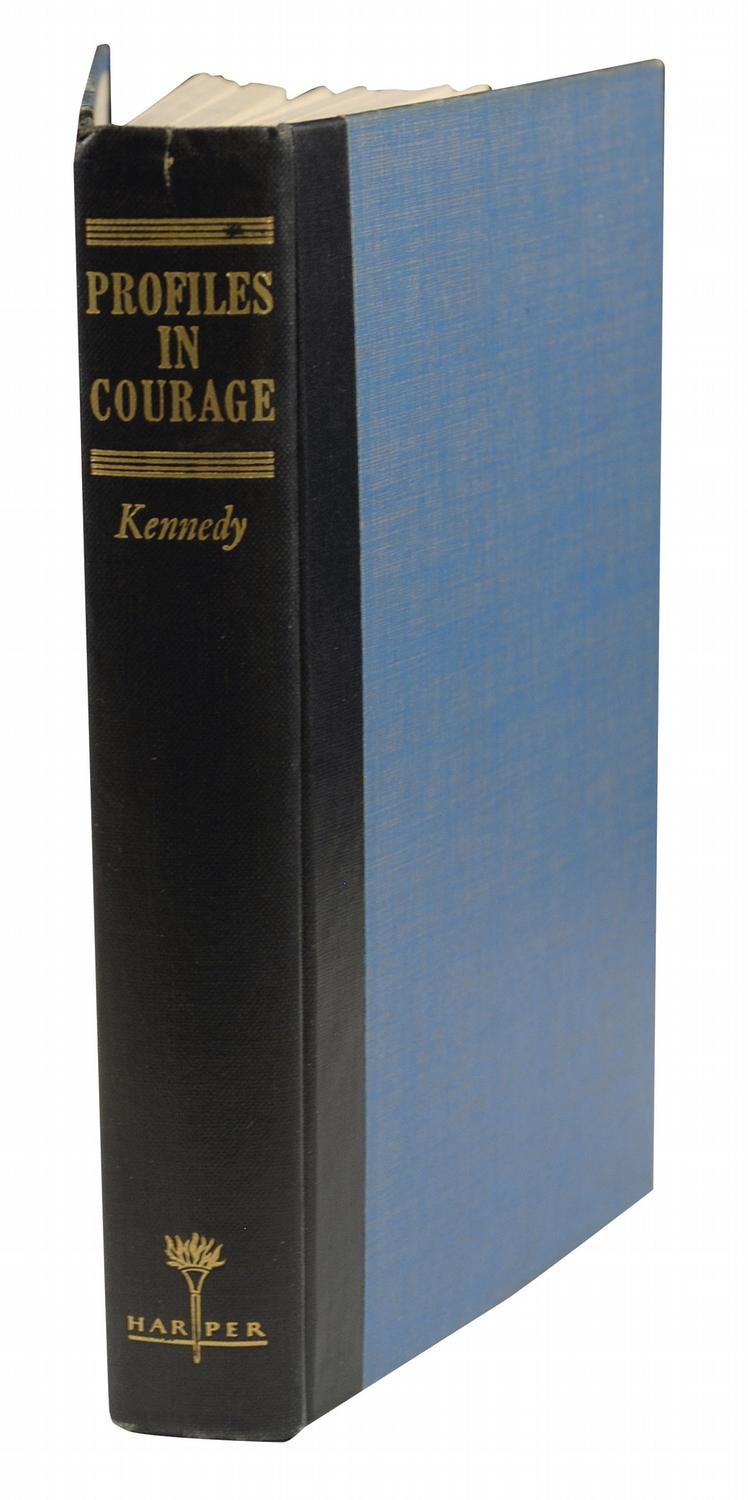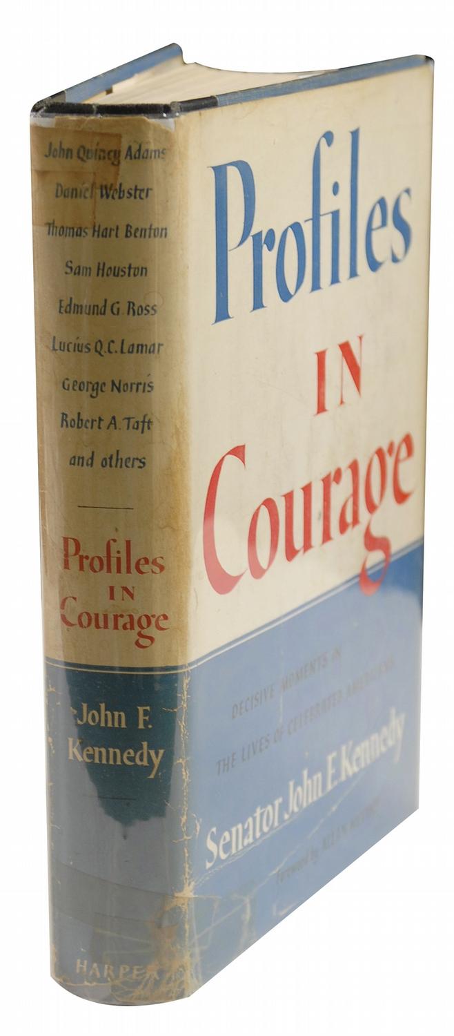 Signed book: Profiles in Courage. Later printing. NY: Harper & Brothers, 1956. Hardcover with dustjacket, 6 x 8.5, 266 pages. Neatly signed and inscribed in ink on the first free end page, “To Shirley Herbert, with very warmest regards, John Kennedy. Albuquerque 1957.” An ex-libris sticker is affixed to the front board as is a Democratic Fund Raising Dinner ticket stub from a March 29, 1957, event at the Hilton Hotel in Albuquerque at which Senator Kennedy was the featured speaker. Twelve other attendees have signed on the half-title page and adjacent page. In very good condition, with heavy irregular toning to the signed page and inside front board, irregular squares of moderate toning to the last page and inside back board, and moderate toning to the dustjacket’s spine with soiling, creasing, and old tape repair. Such irregularities are balanced by JFK’s personal sentiment and relatively neat penmanship!