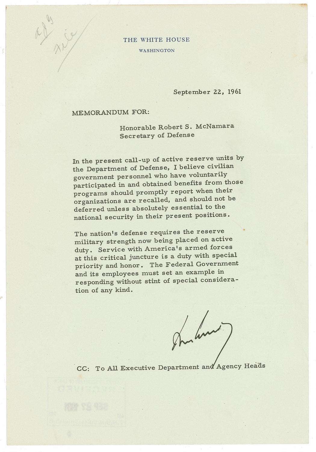 Typed memorandum, signed as president, one page, 7.25 x 10.5, White House letterhead, dated September 22, 1961. To Secretary of Defense Robert S. McNamara, the memo reads, in full: “In the present call-up of active reserve units by the Department of Defense, I believe civilian government personnel who have voluntarily participated in and obtained benefits from those programs should promptly report when their organizations are recalled, and should not be deferred unless absolutely essential to the national security in their present positions. The nation’s defense requires the reserve military strength now being placed on active duty. Service with America’s armed forces at this critical juncture is a duty with special priority and honor. The Federal Government and its employees must set an example in responding without stint of special consideration of any kind.” In fine condition, with pencil file notation to top left, and show-through from an office stamp on reverse of bottom, and a couple small creases.