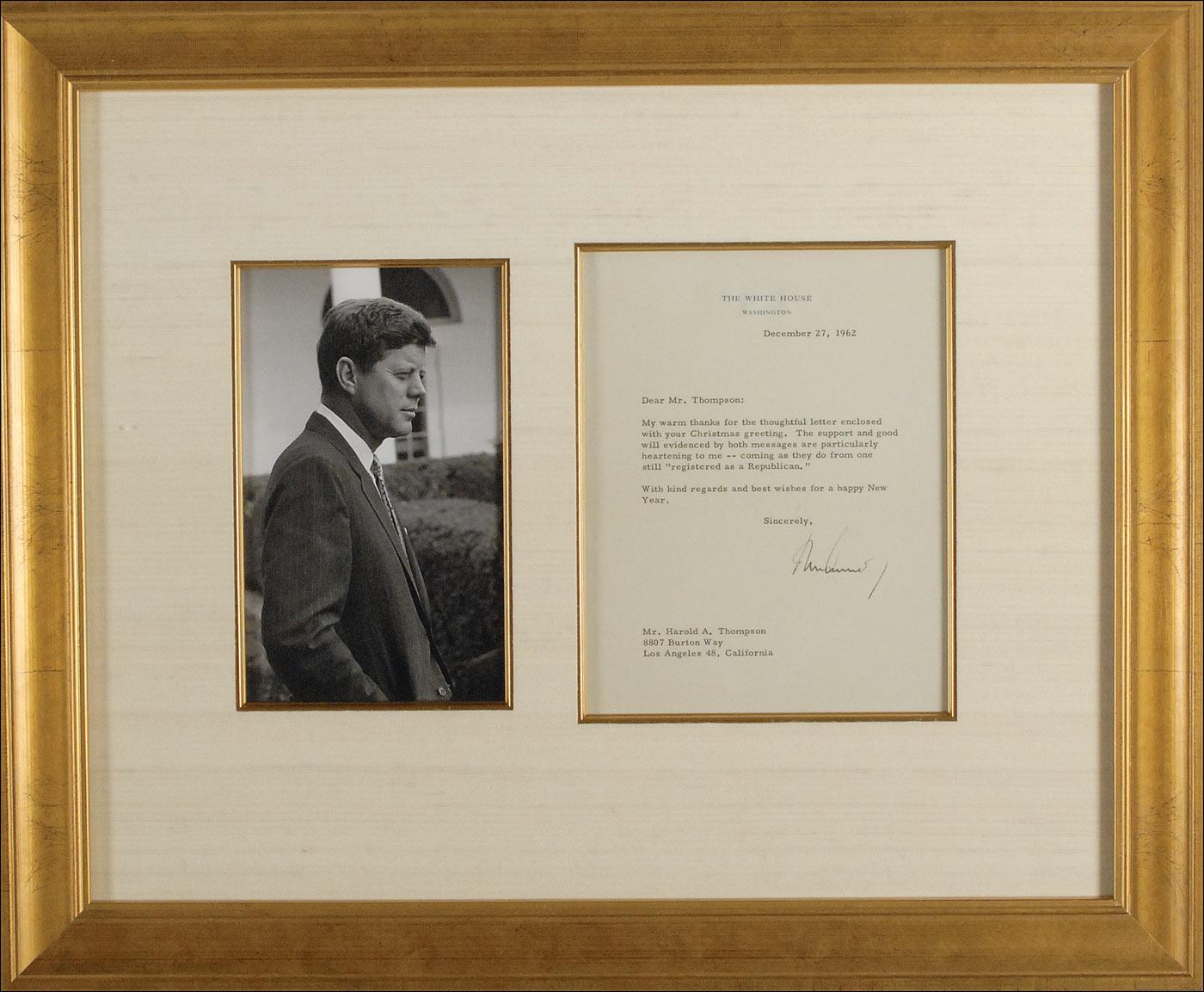 TLS as president, one page, 6.25 x 8, White House letterhead, December 27, 1962. Letter to Harold A. Thompson. In full: “My warm thanks for the thoughtful letter enclosed with your Christmas greeting. The support and good will evidenced by both messages are particularly heartening to me –– coming as they do from one still ‘registered as a Republican.’ With kind regards and best wishes for a happy New Year.” Cloth matted and framed with a portrait of Kennedy outside the White House to an overall size of 21 x 17. In fine condition, with a couple creases along central horizontal fold. A light-hearted letter from the Commander-in-Chief.