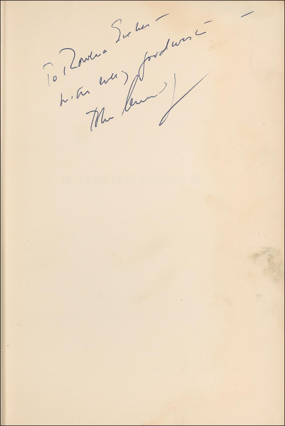 Signed book: Profiles in Courage. Later printing. NY: Harper and Brothers, 1956. Hardcover with dustjacket, 6 x 8.5, 266 pages. Signed and inscribed in blue ballpoint on the first free end page, “To Rowena Eucker, with every good wish, John Kennedy.” In very good condition, with light irregular toning and soiling to the signed page, and damp staining to the top fore edges. Dustjacket shows scattered light soiling and toning, flecks of surface loss along edges and spine, damp staining, and a few small edge tears. The future president’s look at “decisive moments in the lives of celebrated Americans” is still considered a classic!