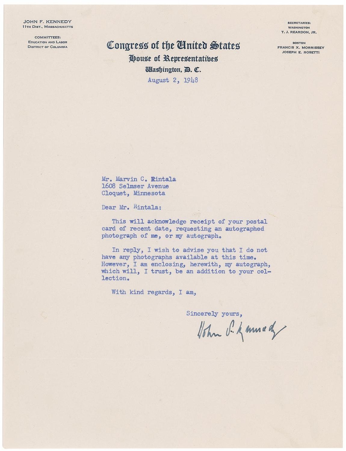 TLS, one page, 8 x 10.5, Congress of the United States letterhead, August 2, 1948. JFK responds to an autograph request from an admirer. In full: “This will acknowledge receipt of your postal card of recent date, requesting an autographed photo of me, or my autograph. In reply, I wish to advise you that I do not have any photographs available at this time. However, I am enclosing, herewith, my autograph, which will, I trust, be an addition to your collection.” In fine condition, with light diagonal creases and wrinkles.