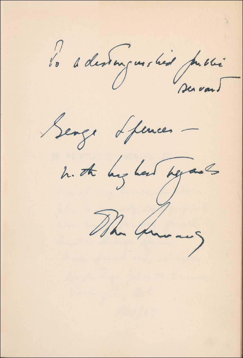 George Lloyd Spencer served in the US Senate representing Arkansas from 1941 to 1943, when the Democrat resigned to return to active duty in the US Naval Reserves during World War II. In addition to their political party affiliation, Kennedy and Spencer had both served in the navy, so it’s no surprise that a senatorial page—who knew both men—would have asked JFK to autograph this copy of his Pulitzer Prize-winning book.