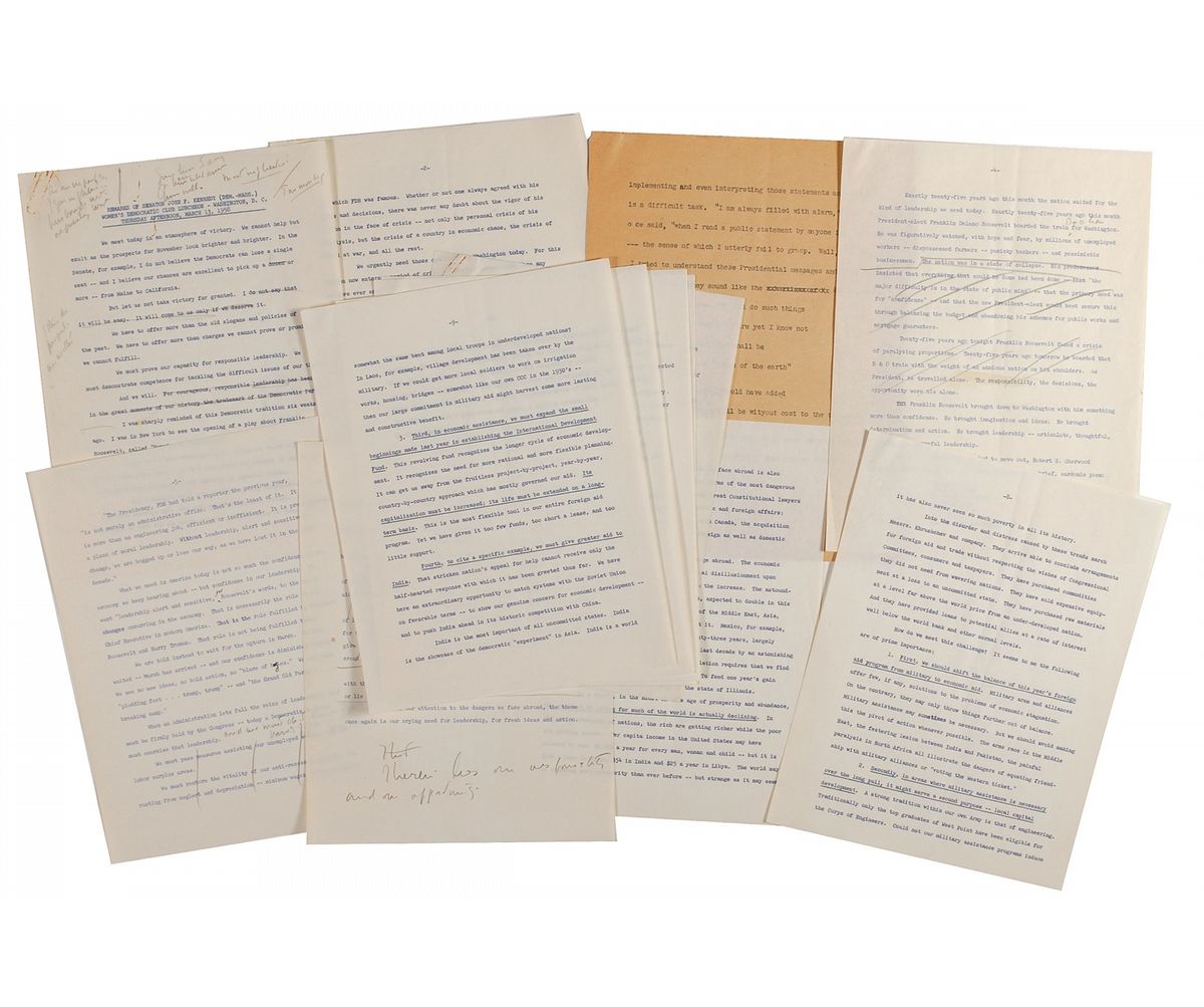 This 1958 speech squarely outlined the need for leadership and need for the Democratic House and Senate to come together to solve the recession at home and neutralize the Soviet threat abroad, showcasing the senator as a potential candidate for 1960 by pointing out the Republicans lack of leadership and ideas. The John F. Kennedy Presidential Library has what appears to be the exact 13-page typescript of this speech as this one except that page 3 is on the same paper as the other 12 pages. The Kennedy Library’s copy, however, does not include any corrections or handwritten additions, so the one here offered is a later, possibly final, draft.