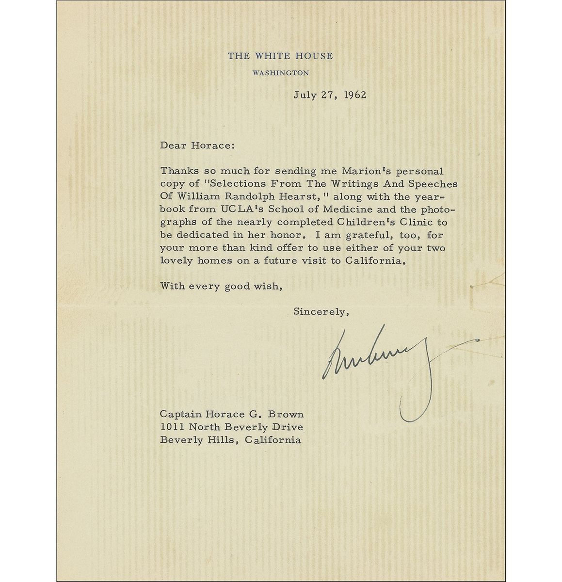 TLS as president, one page, 6.75 x 8.75, White House letterhead, July 27, 1962. Letter to Captain Horace G. Brown. In full: “Thanks so much for sending me Marion’s personal copy of ‘Selections from the Writings and Speeches of William Randolph Hearst,’ along with the yearbook from UCLA’s School of Medicine and the photographs of the nearly completed Children’s Clinic to be dedicated in her honor. I am grateful, too, for your more than kind offer to use either of your two lovely homes on a future visit to California.” In very good condition, with central horizontal fold, and show-through from vertical toning on reverse from once being housed in a magnetic photo album.