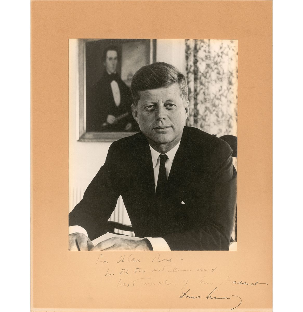 Vintage matte-finish 7.5 x 9.25 photo by Alfred Eisenstaedt, affixed to its original 11 x 14 mount, signed and inscribed in fountain pen “For Alex Rose—with the esteem and best wishes of his friend—John F. Kennedy.” In fine condition, with most of the inscription and sentiment fairly light, but mostly legible, due to decreased ink flow, with signature remaining quite bold, light silvering to edges of image, and uniform toning to mount. The renowned photographer took this portrait at JFK’s home in August 1960 after he had received the Democratic nomination for president. Kennedy and his staffers found the image to be so ‘presidential’ that it was used by the White House during his entire administration. The original recipient of this particular photo was Alex Rose (1898-1976), a labor leader in the American Hatters' Union who went on to become co-founder of the American Labor Party, vice-chairman of the Liberal Party of New York, and widely considered to have been one of the most brilliant political strategists of the 20th century. Accompanied by a copy of an article from the Dec. 8, 1969, issue of New York Magazine, about Alex Rose and his friendship with JFK and including mention of the signed photographs on his wall.