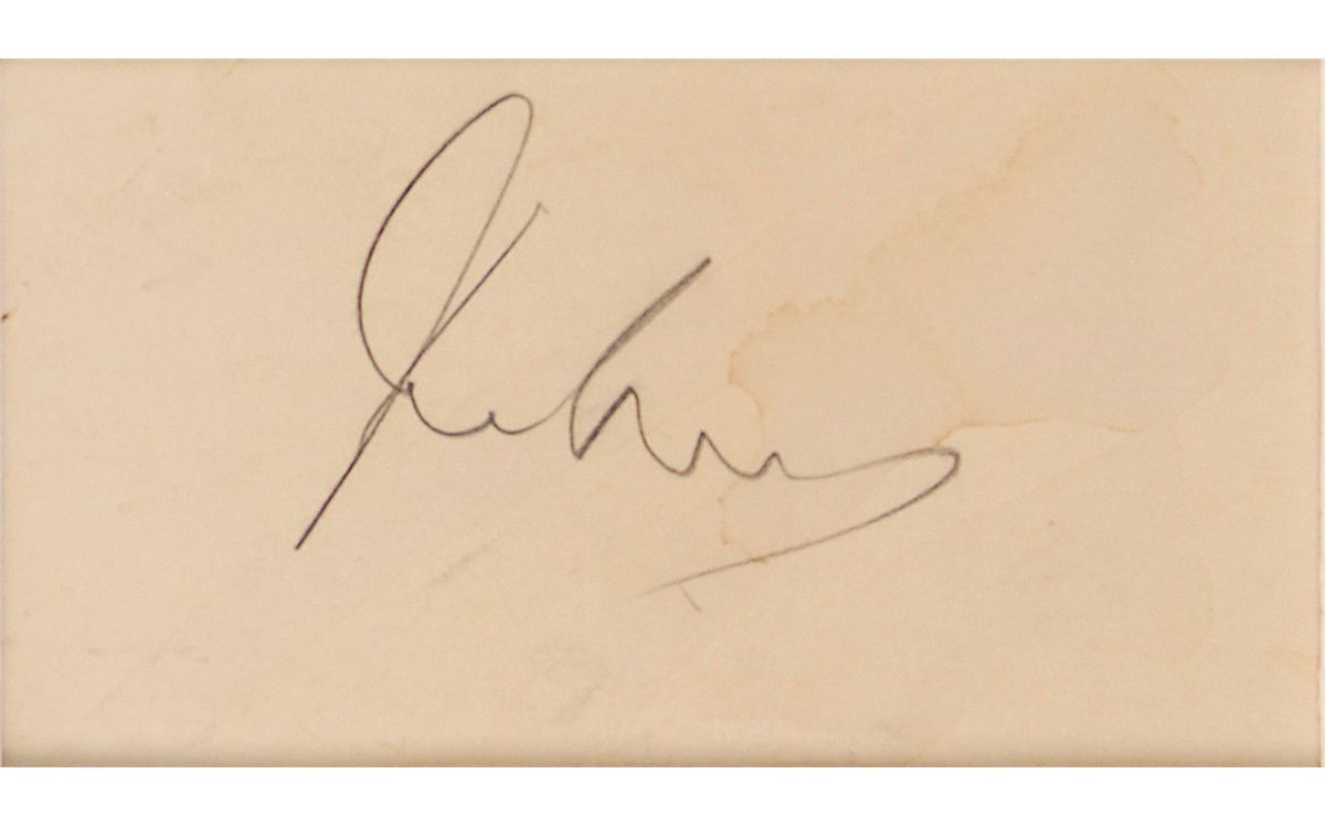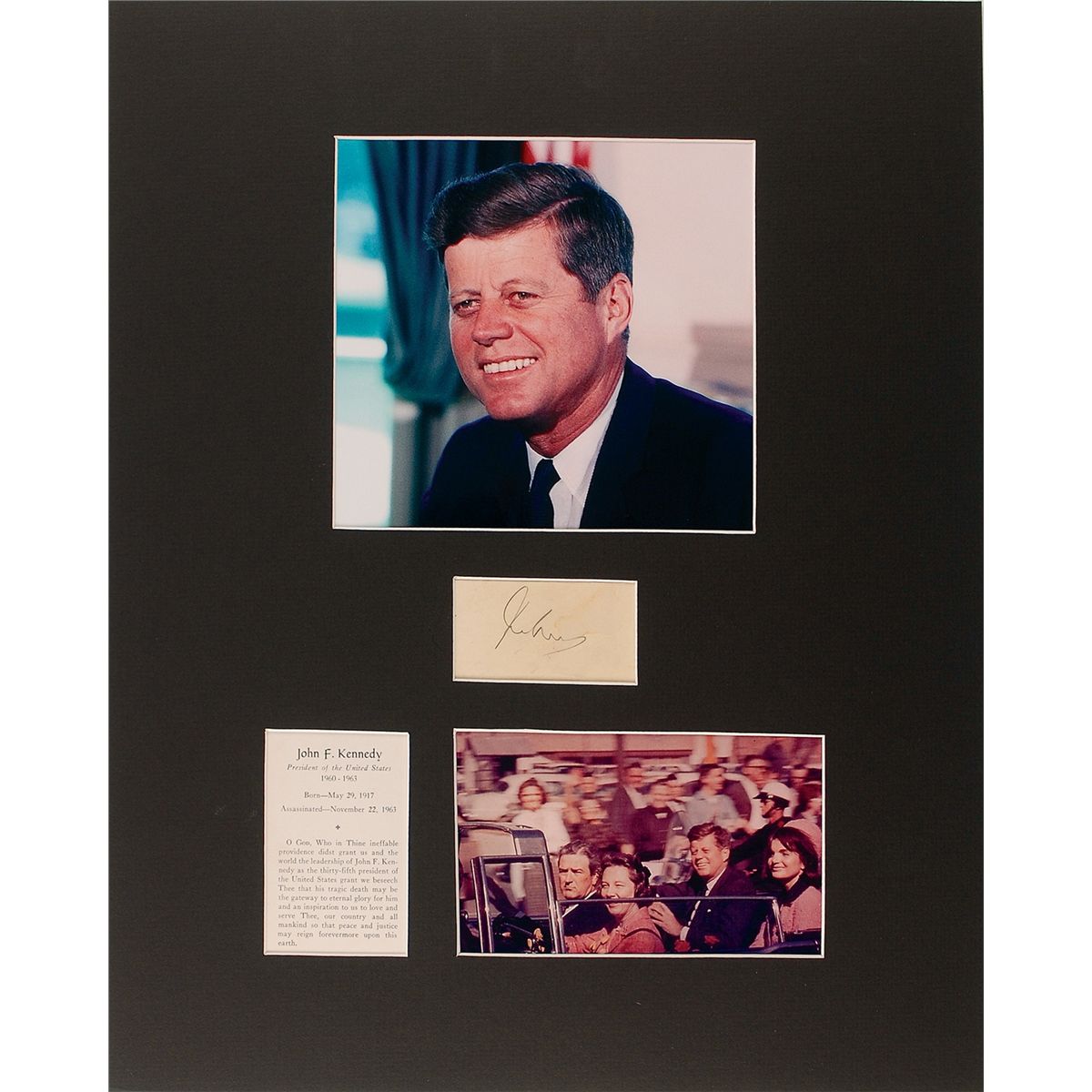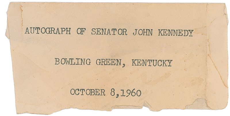 Pencil signature, “John Kennedy,” on the reverse of an off-white 3.5 x 2 Keen Johnson, U. S. Senator campaign card. Matted with a color portrait of Kennedy, a color photo of the Kennedys and Connallys driving through Dallas, and a small memorial card, to an overall size of 16 x 20. In very good condition, with scattered toning and dampstaining lightly affecting portions of signature and mounting remnants to reverse. Accompanied by a small typed caption indicating signature was acquired in Bowling Green, Kentucky on October 8, 1960.