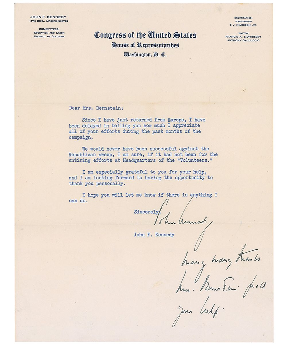TLS, one page, 8 x 10.5, Congress of the United States letterhead, no date, [but circa December 1952]. Letter to Mrs. Bernstein. In full: “Since I have just returned from Europe, I have been delayed in telling you how much I appreciate all of your efforts during the past months of the campaign. We would never have been successful against the Republican sweep, I am sure, if it had not been for the untiring efforts at Headquarters of the ‘Volunteers.’ I am especially grateful to you for your help, and I am looking forward to having the opportunity to thank you personally. I hope you will let me know if there is anything I can do.” In a nine-word handwritten postscript, Kennedy adds “Many many thanks Mrs. Bernstein for all your help.” Intersecting folds, with two folds lightly passing through Kennedy’s signature and a few wrinkles, otherwise fine condition. On November 4, 1952, Republican presidential nominee Dwight D. Eisenhower swept New England’s 40 electoral votes, winning Massachusetts. In the race for US Senate, three-term Congressman John F. Kennedy defeated the incumbent Republican Sen. Henry Cabot Lodge.