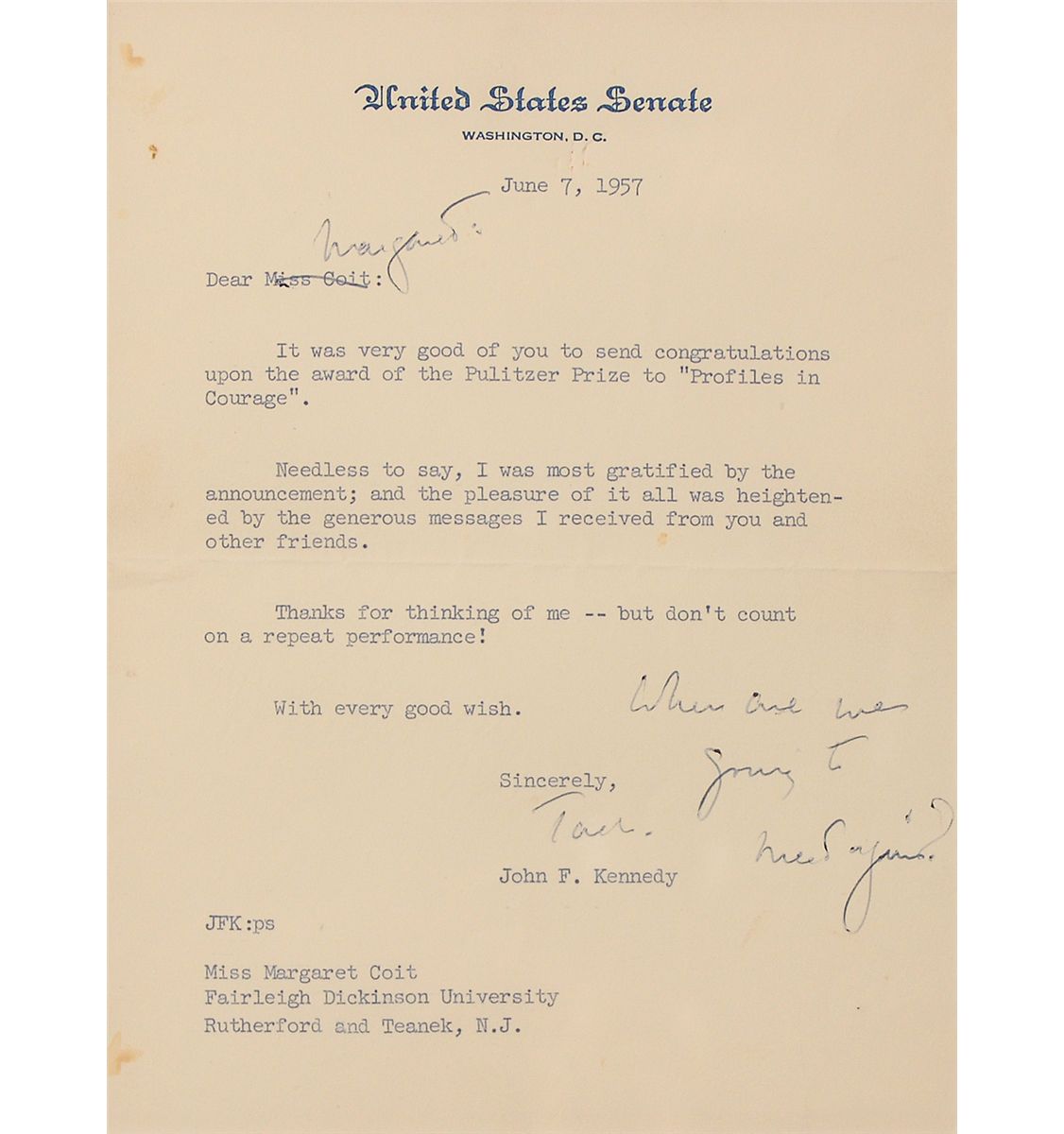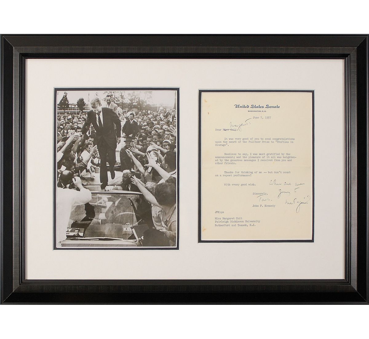 TLS signed “Jack,” one page, 6.25 x 8.25, United States Senate letterhead, June 7, 1957. Letter to Margaret Coit at Farleigh Dickinson University. In full: “It was very good of you to send congratulations upon the award of the Pulitzer Prize to ‘Profiles in Courage.’ Needless to say, I was most gratified by the announcement; and the pleasure of it all was heightened by the generous messages I received from you and other friends. Thanks for thinking of me—but don’t count on a repeat performance.” Kennedy also adds a brief postscript reading, “When are we going to meet again?” and crosses out the formal greeting to read “Margaret.” Double matted and framed with a photo of Kennedy surrounded by an adoring crowd to an overall size of 20.5 x 15. In fine condition, with a few small light stains to left edge.