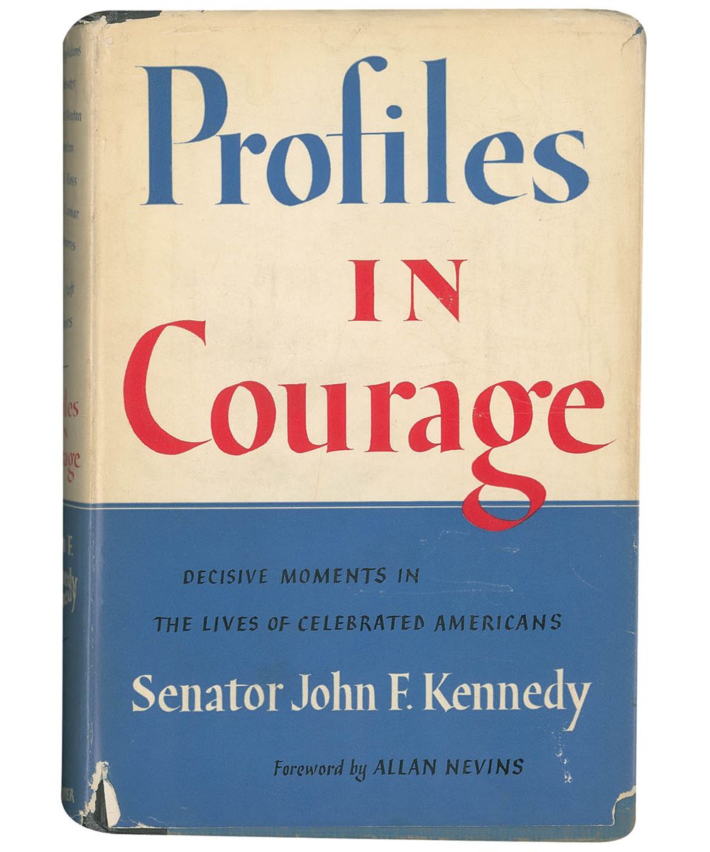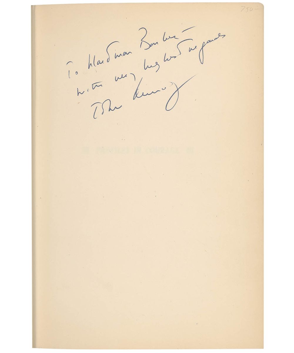 Signed book: Profiles in Courage. Later printing. NY: Harper and Brothers, 1956. Hardcover with dustjacket, 5.75 x 8.5, 266 pages. Signed and inscribed on the first free end page, “To Wardman Barber—with my highest regards, John Kennedy.” In fine condition, with a small pencil notation to signed page, as well as some mild edge toning.
