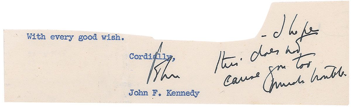 Ink signature, “John,” and a handwritten postscript on an off-white 6.25 x 2 irregularly clipped slip taken from the closing of a letter. The postscript reads, “I hope this does not cause you too much trouble.” In fine condition, with a vertical fold to left side and irregular edges.
