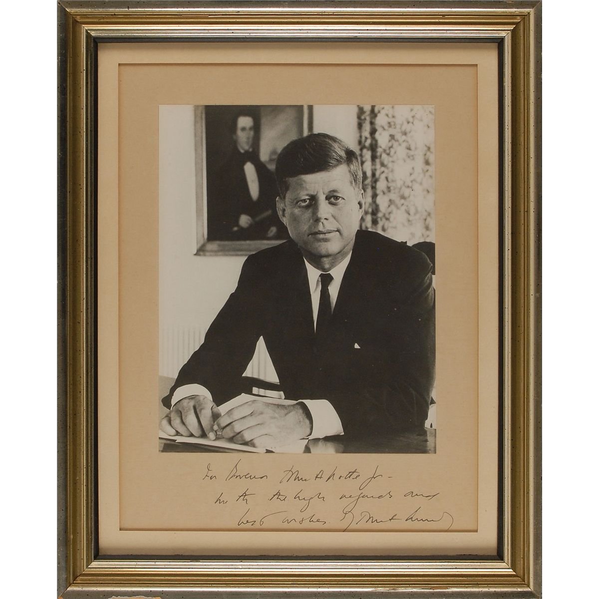 Vintage matte-finish 7.5 x 9.25 photo, affixed to its original 9.75 x 13 mount, signed and inscribed on the mount in fountain pen, as president, “For Governor John A. Notte, Jr., with the high regards and best wishes of John F. Kennedy.” Matted and framed to an overall size of 13 x 16. In fine condition.