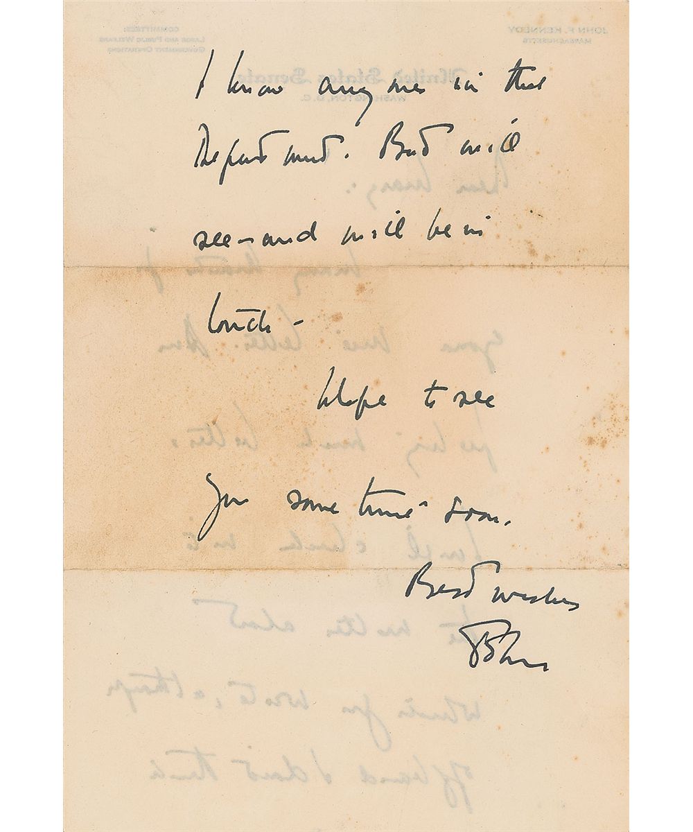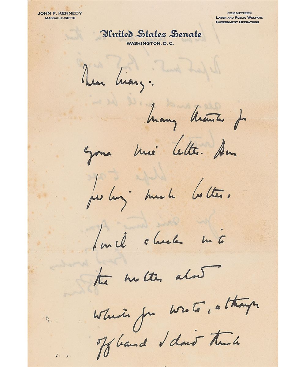 ALS signed “John,” one page both sides, 6.25 x 9.25, Senate letterhead, no date [1953–1960]. Kennedy writes to Mary, a Massachusetts woman active in local and national politics. In full: “Many thanks for your nice letter. Am feeling much better. I will check into the matter about which you wrote, although offhand I don’t think I know anyone in that Department. But will see and will be in touch. Hope to see you sometime soon.” In very good condition, with scattered toning and foxing (heavier to reverse), and several creases and wrinkles. The signature is bold and unaffected, and the writing is unusually legible for Kennedy. Kennedy underwent several spinal operations in the 1950s, nearly dying on a number of occasions and he was often absent from the Senate. During this period, he wrote his Pulitzer Prize–winning book Profiles in Courage, which described eight instances in which US Senators risked their careers by standing by their personal beliefs.