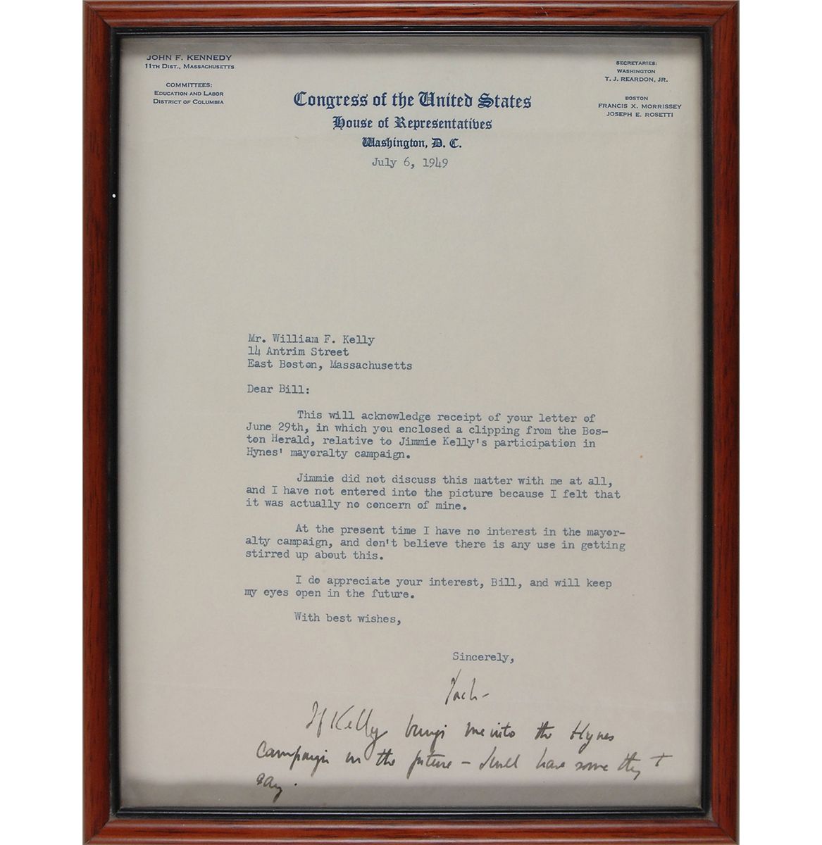 TLS signed “Jack,” one page, 7.5 x 10, Congress of the United States letterhead, July 6, 1949. Letter to William F. Kelly in East Boston. In full: “This will acknowledge receipt of your letter of June 29th, in which you enclosed a clipping from the Boston Herald, relative to Jimmie Kelly’s participation in Hynes’ mayoralty campaign. Jimmie did not discuss this matter with me at all, and I have not entered into the picture because I felt that it was actually no concern of mine. At the present time I have no interest in the mayoralty campaign, and don’t believe there is any use in getting stirred up about this. I do appreciate your interest, Bill, and will keep my eyes open in the future.” Under his signature, Kennedy adds a short handwritten postscript which reads, “If Kelly brings me into the Hynes campaign in the future—I will have some thing to say.” Framed to an overall size of 8.75 x 11.25. In fine condition, with a horizontal mailing fold through bottom portion of signature. Hynes was challenging James Michael Curley for mayor of Boston, after Curley made disparaging remarks of Hynes’s performance as acting mayor in 1947 while Curley served five months in prison.