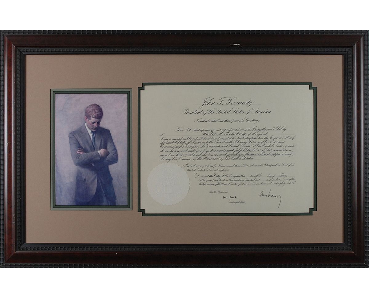 DS as president, signed “John Kennedy,” one page, trimmed in size to 15.25 x 11.75 and mounted to a heavy stock board, May 12, 1962. Kennedy appoints a US representative to a meeting in Europe. In part: “Reposing special trust and confidence in the Integrity and Ability of Walter M. Kotschnig, of Maryland, I have nominated, and…do appoint him the Representative of the United States of America to the Seventeenth Plenary Session of the Economic Commission for Europe of the Economic and Social Council of the United Nations, and do authorize and empower him to execute and fulfill the duties of this commission, according to law, with all the powers and privileges thereunto of right appertaining, during the pleasure of the President of the United States.” Double-matted and framed, with a color portrait of a pensive President Kennedy, eyes downcast and arms folded, to an overall size of 32 x 20.5. Trimming and mounting as noted, otherwise fine, clean condition.