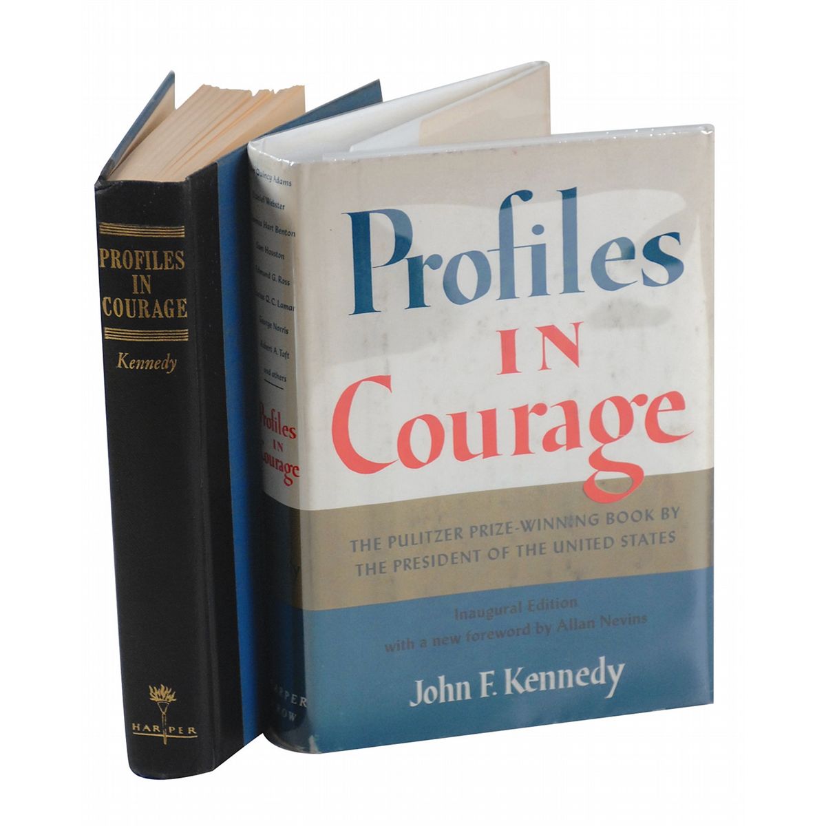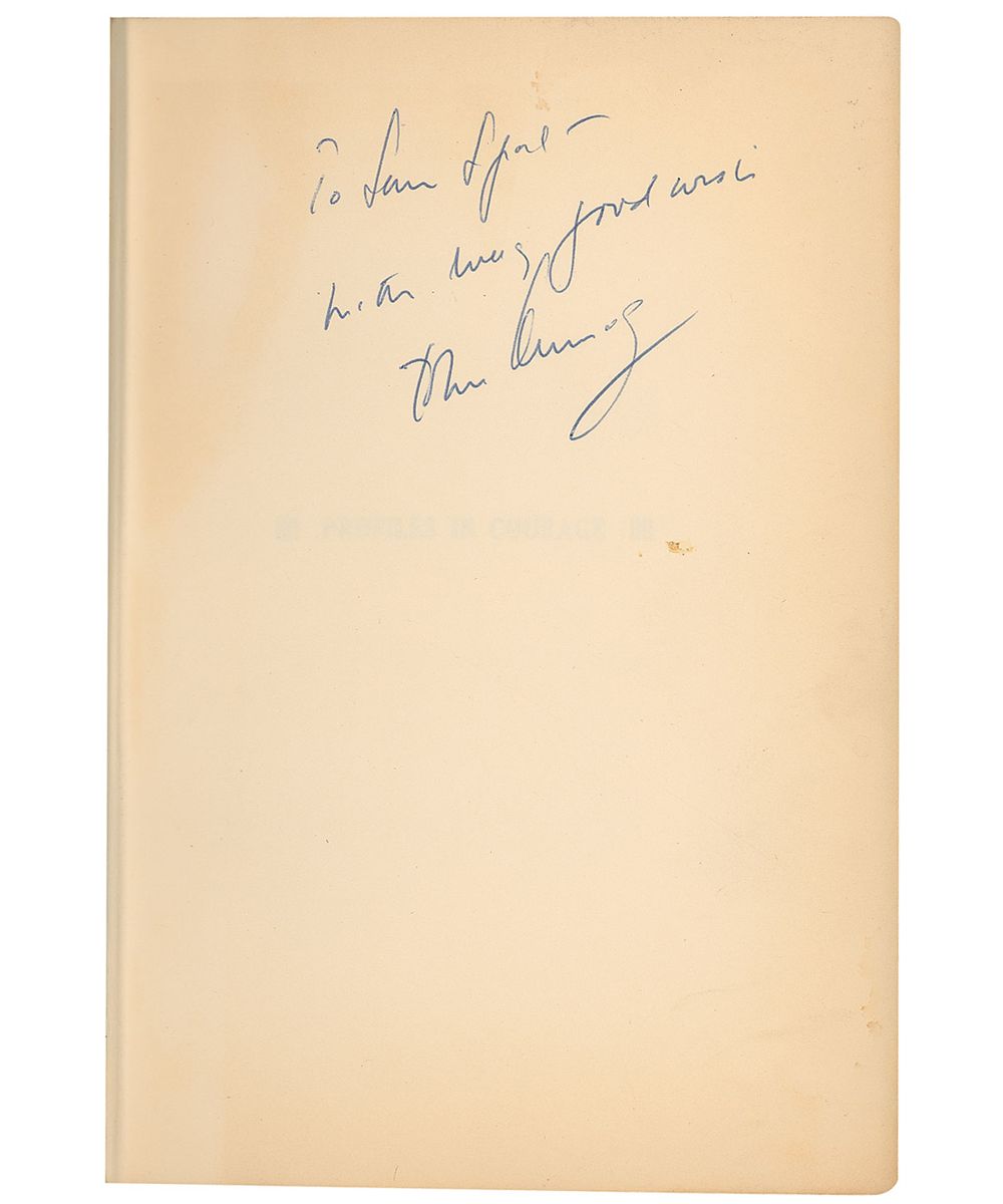 Signed book: Profiles in Courage. Later printing. NY: Harper and Brothers, 1956. Hardcover with dust jacket, 6 x 8.5, 266 pages. Signed and inscribed on the first free end page in blue ballpoint. Autographic condition: fine, with some scattered mild toning to signed page. Book condition: VG+/VG+. Black cloth-covered spine and blue paper-covered boards; light rubbing along edges; very light waterstain visible on front cover and edges of front pastedown/ffep; slightly yellowed. Dust jacket in protective mylar sleeve; few small tears and creases at corners and spine-ends; rubbed and lightly soiled; price-clipped.