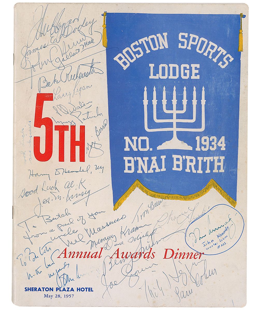 Program for the fifth annual Boston Sports Lodge B’nai B’rith Awards Dinner held on May 28, 1957, 8.5 x 11, signed on the front cover in fountain pen, “John Kennedy,” and signed and inscribed again in the lower left in blue ballpoint, “To Butch, with best regards, John Kennedy.” Also signed in blue ballpoint by Yogi Berra, Joe Cronin, Benny Friedman, Muzz Patrick, and various other participants. In very good condition, with Kennedy’s signature to the right side circled and notated in an unknown hand, skipping to ink in Kennedy’s surname in the signature to the left, and subtle scattered foxing. Accompanied by a full letter of authenticity from JSA.
