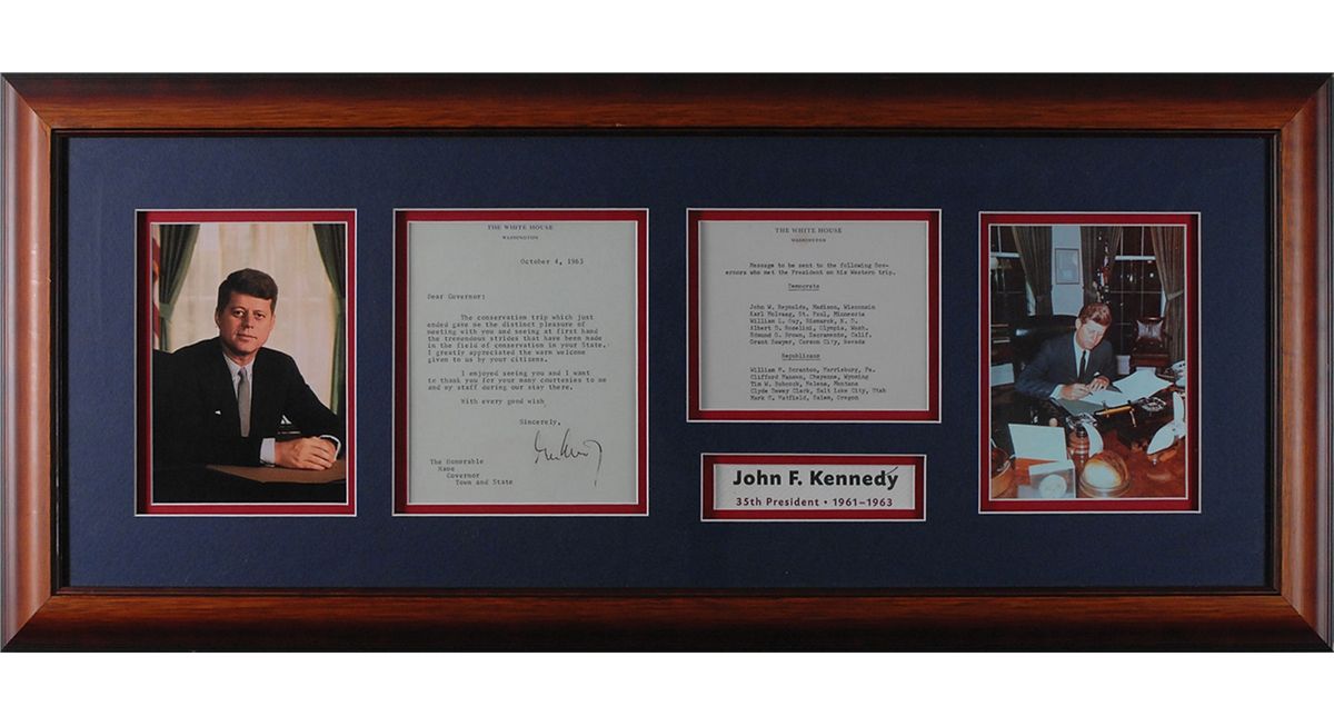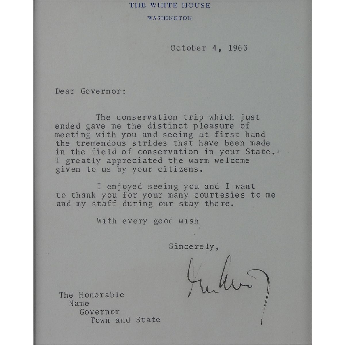 Draft TLS as president, one page, 5.5 x 6.5, White House letterhead, October 4, 1963. The draft of a form letter sent to 11 governors who Kennedy met while on a trip west. In full: “The conservation trip which just ended gave me the distinct pleasure of meeting with you and seeing first hand the tremendous strides that have been made in the field of conservation in your State. I greatly appreciated the warm welcome given to us by your citizens. I enjoyed seeing you and I want to thank you for your many courtesies to me and my staff during our stay there.” Also included is a sheet of White House stationery with a typed list of the governors to whom the letter is to be sent, headed at the top, “Message to be sent to the following Governors who met the President on his Western trip, and listing all 11 governors and their states. Double-matted and framed with two color photos of Kennedy to an overall size of 32 x 14. In fine condition, with some minor skipping to the rapid signature.