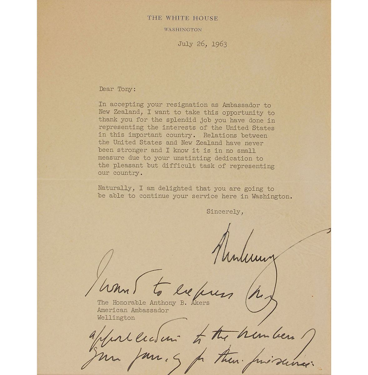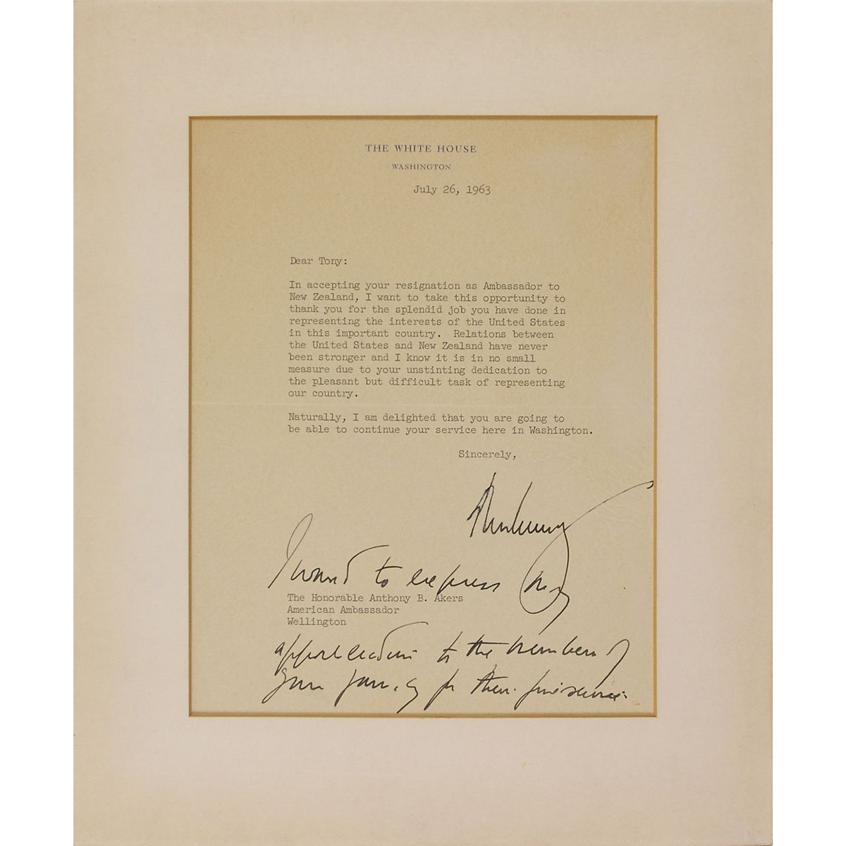 TLS as president, one page, 6.5 x 8.25, White House letterhead, July 26, 1963. Letter to Anthony B. Akers. In part: “In accepting your resignation as Ambassador to New Zealand, I want to take this opportunity to thank you for the splendid job you have done in representing the interests of the United States in this important country. Relations between the United States and New Zealand have never been stronger and I know it is in no small measure due to your unstinting dedication to the pleasant but difficult task of representing our country.” In a handwritten postscript, Kennedy adds, “I want to express my appreciation to the members of your family for their fine service.” Simply matted to an overall size of 10 x 12. In fine condition, with moderate overall toning; all handwriting remains extremely bold. Accompanied by an unsigned photo.