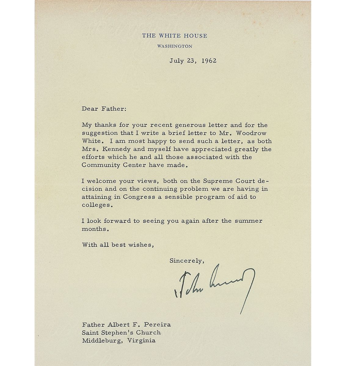 TLS as president, one page, 6.75 x 8.75, White House letterhead, July 23, 1962. Letter to Father Albert Pereira. In full: “My thanks for your recent generous letter and for the suggestion that I write a brief letter to Mr. Woodrow White. I am most happy to send such a letter, as both Mrs. Kennedy and myself have appreciated greatly the efforts which he and all those associated with the Community Center have made. I welcome your views, both on the Supreme Court decision and on the continuing problem we are having in attaining in Congress a sensible program of aid to colleges.” In fine condition, with some mild toning along top edge. Accompanied by two TLSs to Pereira from Pierre Salinger and a third from Pereira to Kennedy’s assistant, Kenneth O’Donnell.
