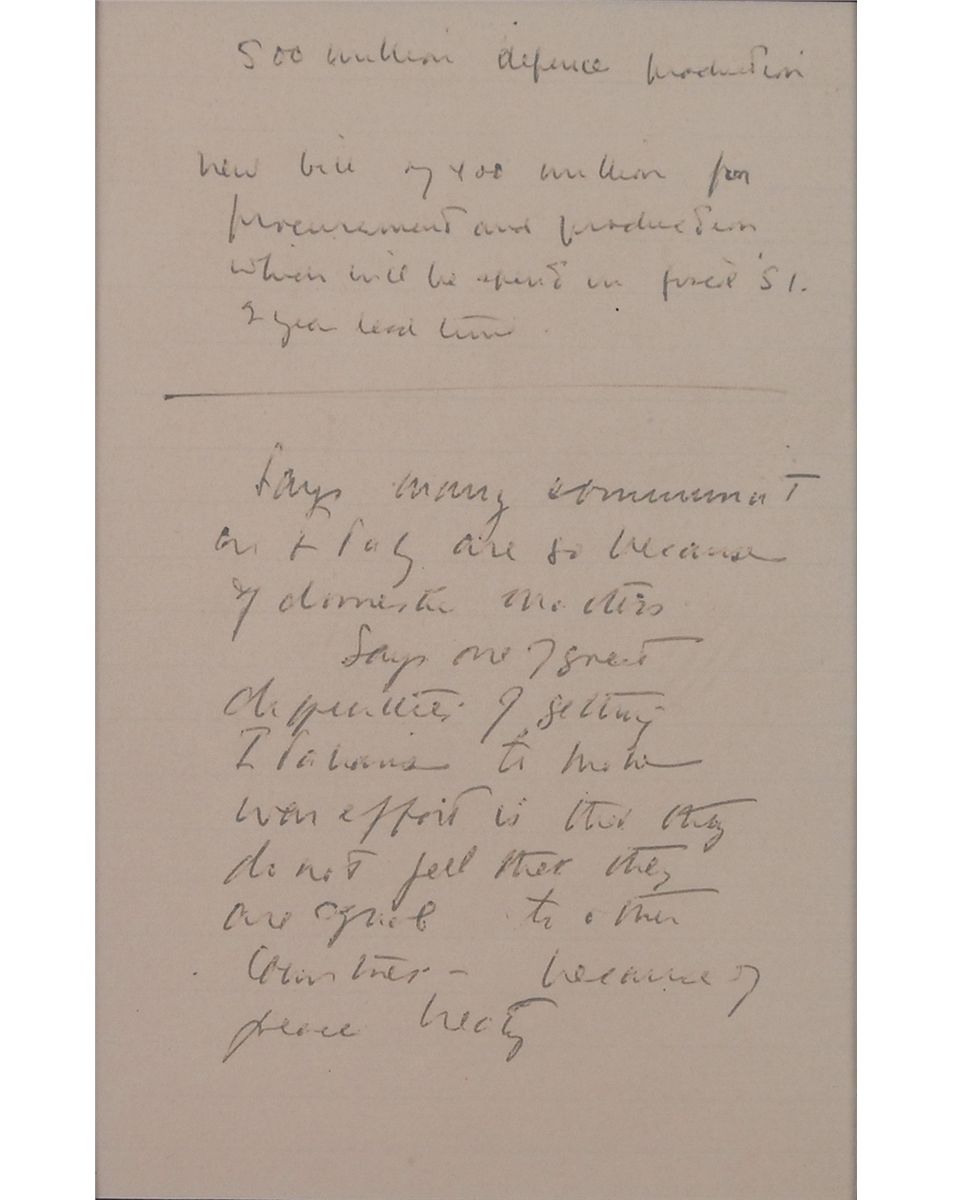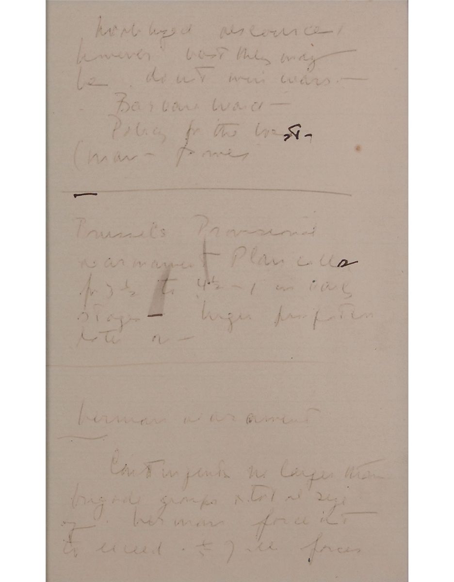 Kennedy’s unsigned handwritten notes on two off-white 4.25 x 7 lightly-lined sheets. Over 70 words in Kennedy’s hand, with complete transcriptions done by Evelyn Lincoln accompanying the piece. A sampling of the notes includes: “Mobilized resources however vast they may be.do [sic] not win wars—Barbara Ward Policy of the West,” “German armament; contingents no larger than brigade groups start at size of German force not to exceed 1/5 of all forces,” and “Says many communist in Italy are so because of domestic matters. Says one of the greatest difficulties of getting Italians to make war effort is that they do not feel that they are equal to other countries because of peace treaty.” A typed letter of provenance accompanies the notes and reads, “John F. Kennedy always kept a small, black notebook accessible so that he could jot down thoughts that came to him…After recording his thoughts he would tear out the page and keep it handy for future reference. The handwritten notes, which you now have in your possession, are two of those pages.” Archivally matted and framed with a portrait of Kennedy on the phone and jotting down some notes, with Lincoln’s transcripts affixed to reverse, along with the typed provenance, to an overall size of 24.75 x 17. In fine condition, with the writing on one page a couple shades light but still completely legible, and a couple trivial ink brushes to the second page. With a notable reference to British economist and Cambridge friend Barbara Ward’s Policy for the West, a book that greatly impacted Kennedy’s views on international politics, this item gives an extraordinary glimpse into the unedited thoughts of the future president. Oversized.