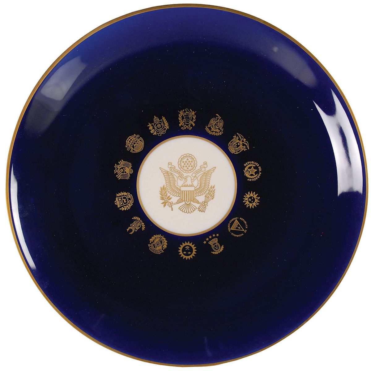 Cobalt-blue dinner plate specially produced for the Dinner of the Inter-American Press Association [IAPA] in honor of President John Fitzgerald Kennedy, held at the Hotel Americana in Miami Beach on November 18, 1963. Plate measures 10.5” in diameter with gilt edging and gilt ornamentation of the presidential seal as well as the coats of arms of the IAPA's 14 member states. A manufacturer's imprint on the cream underside reads, "Syracuse - China - 93 G U.S.A."