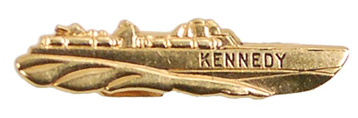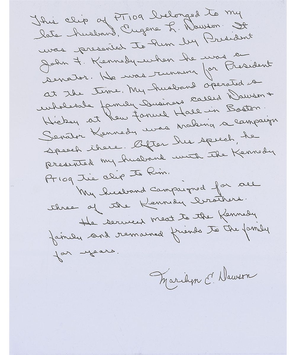 Original John F. Kennedy PT-109 tie clip. Clip measures 1.5? long, with “Kennedy” printed near the bow and the clasp stamped “Jolle.” Accompanied by a copy of a letter of provenance from the wife of the recipient. Letter reads, in part: “This clip of PT-109 belonged to my late husband, Eugene L. Dawson. It was presented to him by President John F. Kennedy…He was running for President at the time. My husband operated a wholesale family business…at new Fanuel Hall in Boston. Senator Kennedy was making a campaign speech there. After his speech, he presented my husband with the Kennedy PT 109 clip.” In fine condition. Accompanied by three letters from Ted Kennedy to Mr. or Mrs. Dawson (one signed, two printed signatures), two Senate passes issued to the Dawsons, a printed note to Mrs. Dawson from Gerald Ford, and a candid photo of a young Ted Kennedy posing with three young ladies, including Mrs. Dawson.