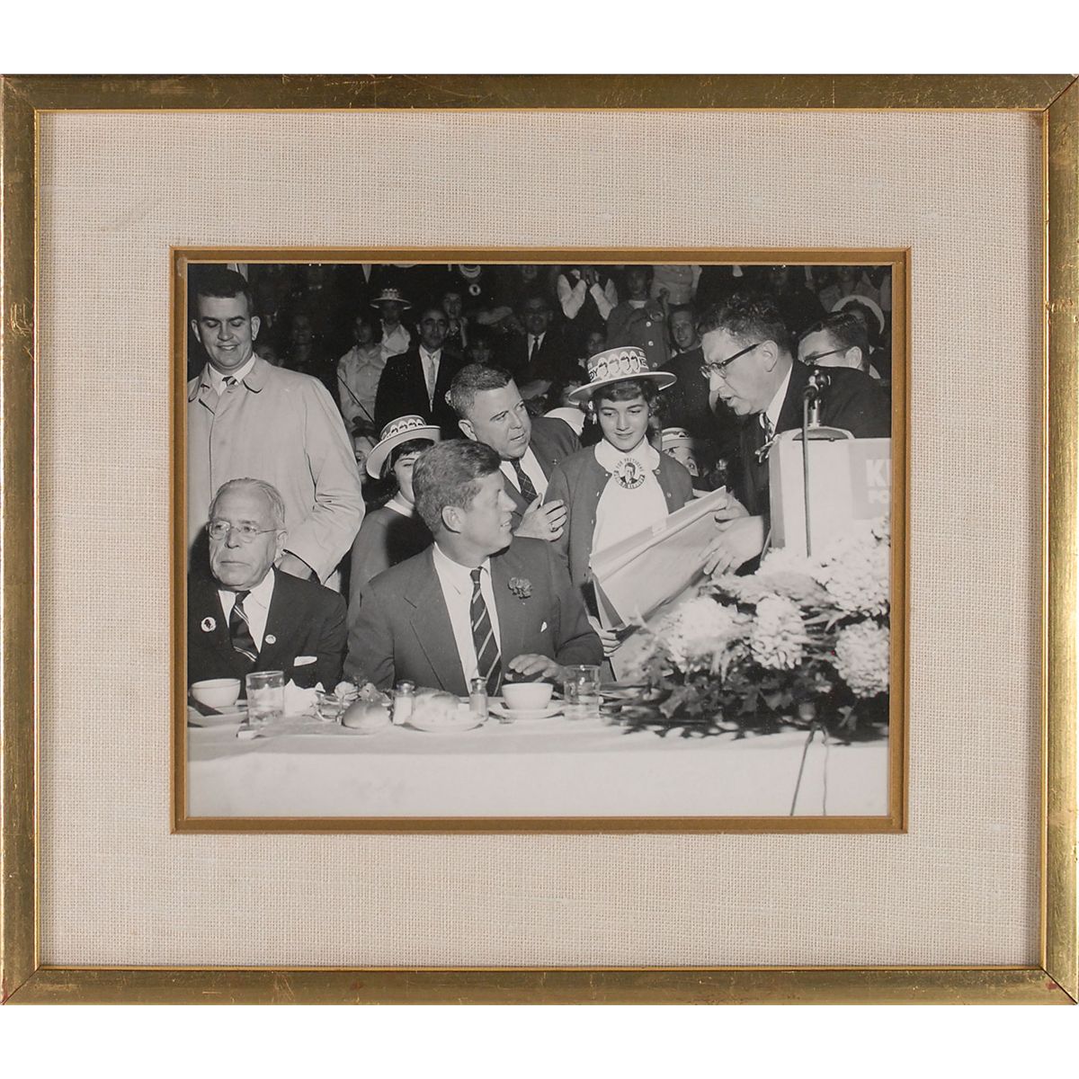 Two original unsigned vintage glossy photos: a 9 x 7.25 photo of Kennedy seated at the head table during a presidential campaign dinner, with two young supporters behind him, double-cloth-matted and framed to an overall size of 14 x 12; and a 7.5 x 9 image of Kennedy at the same dinner pointing to a sheet in front of him, matted and framed to an overall size of 10.75 x 12.75. In fine condition, with some mild rippling to first photo.