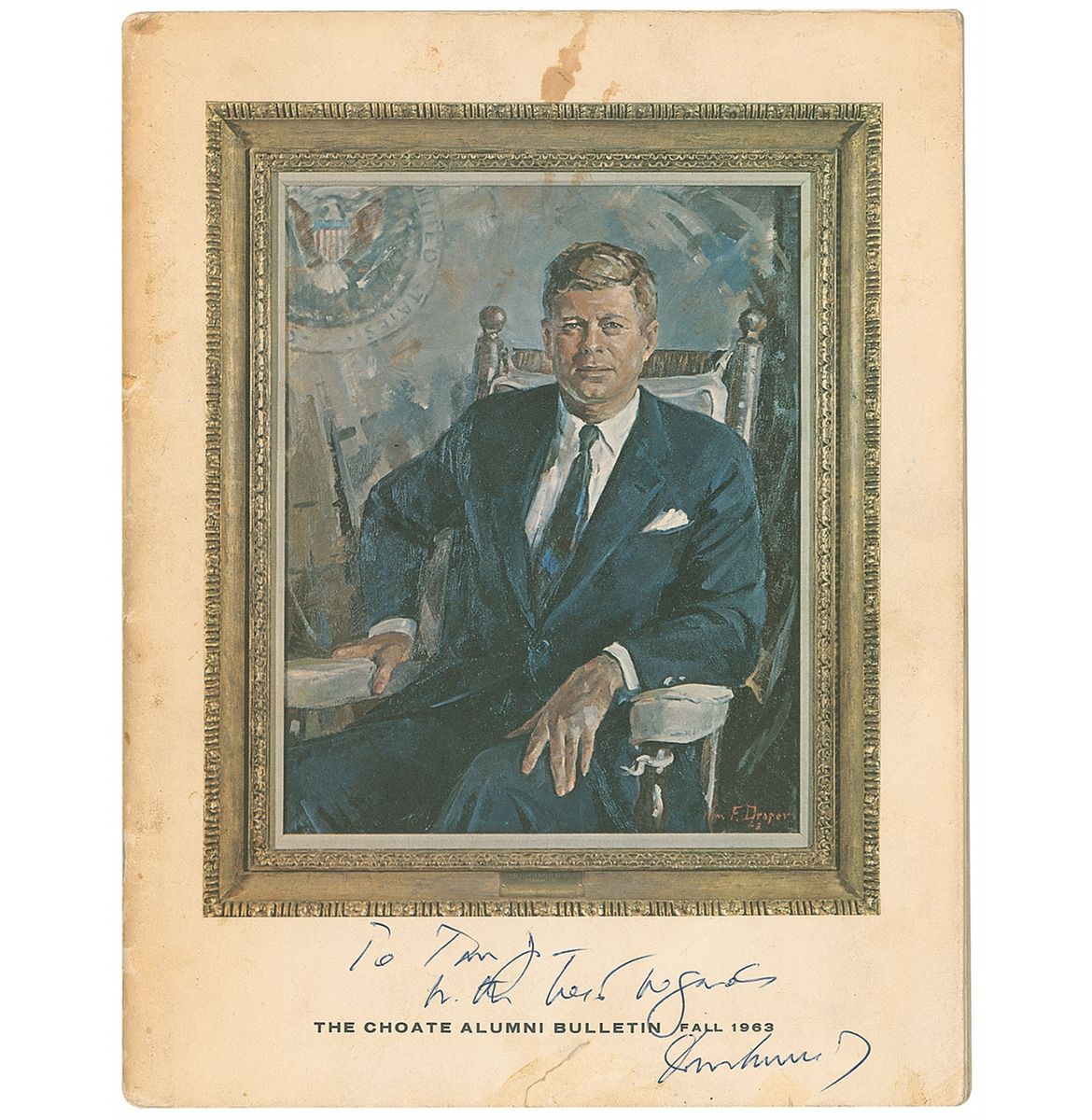 Choate alumni bulletin depicting a portrait of President Kennedy on the front cover, issued between August and November 1963, 8.25 x 10.75, 56 pages, signed and inscribed below his image in blue ballpoint, “To Tom Jr., with best regards, John Kennedy.” In very good condition, with a tape-repaired tear to the lower edge and some scattered stains to edges. Accompanied by a clean, unsigned example of the bulletin. Kennedy attended Choate from 1931 to 1935, and was elected as ‘most likely to succeed’ from his graduating class.
