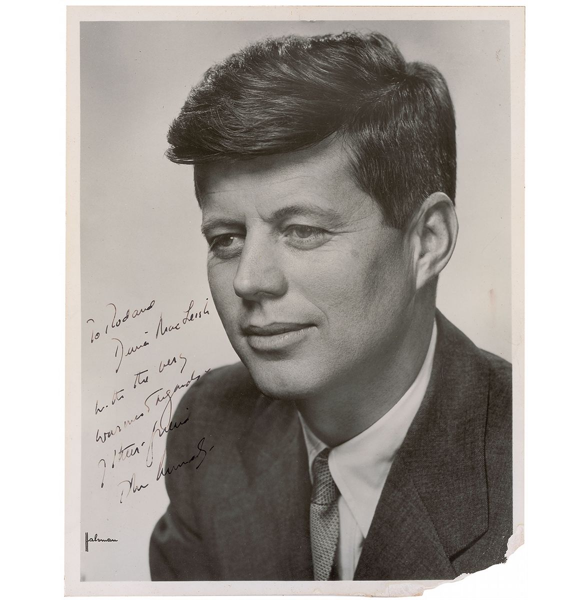 Exquisite, crystal-clear vintage glossy 8.5 x 11 portrait of Kennedy as a Massachusetts senator, signed and inscribed in fountain pen, “To Rod and Diana MacLeish, with the very warmest regards of their friend, John Kennedy.” Originally taken by renowned photographer Philippe Halsman in 1952. Affixed to a same-size mount. Paper loss to lower right which could mostly be matted out, otherwise fine condition. Rod MacLeish was an accomplished journalist who was news director for WBZ radio in Boston in the early 1950s, going on to be a commentator for CBS News, National Public Radio, and the Christian Science Monitor. Halsman’s photographs are highly collectible even unsigned, and the association with an important political commentator makes this example a unique and exceptionally desirable portrait.