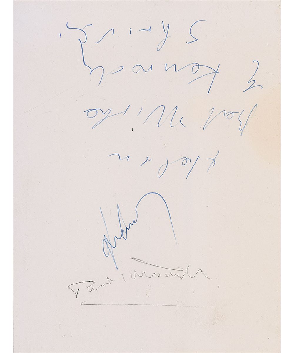 Ballpoint signature, “John Kennedy,” on an off-white 5.5 x 7 sheet, also signed and inscribed, “Helen, Best wishes, E. Kennedy Shriver,” and “Paul Douglas,” a senator from Illinois. In fine condition, with Eunice’s signature upside down.