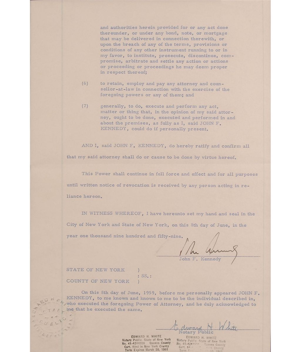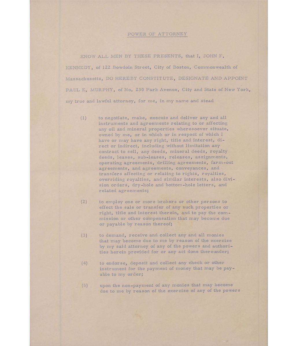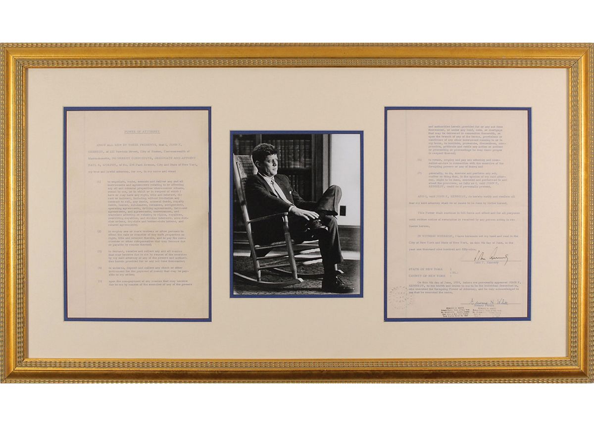 DS, signed “John Kennedy,” two pages, 8 x 11.75, June 8, 1959. An interesting power of attorney document, in part: “Know all men by these presents, that I, John F. Kennedy, of 122 Bowdoin Street, City of Boston, Commonwealth of Massachusetts, do hereby constitute, designate, and appoint Paul E. Murphy, of No. 230 Park Avenue, City and State of New York, my true and lawful attorney, for me, in my name and stead.” Gorgeously double-matted and framed with a photo of Kennedy in his rocking chair to an overall size of 34 x 19.5. In fine condition, with expected document wear. Murphy worked in Joseph Kennedy's New York office, where he oversaw some of the family’s business and issued checks for JFK’s expenses. An unusual document signed by Senator Kennedy at a distinct turning point in his political career—just six months later, he would announce his presidential candidacy. Oversized.