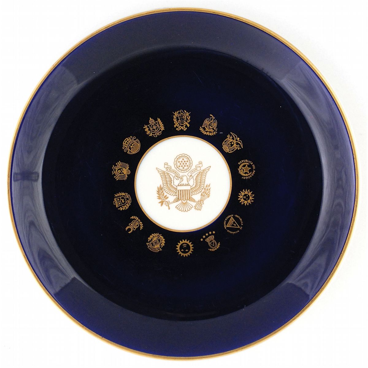 Cobalt-blue dinner plate specially produced for the Dinner of the Inter-American Press Association [IAPA] in honor of President John Fitzgerald Kennedy, held at the Hotel Americana in Miami Beach on November 18, 1963. Plate measures 10.5? in diameter with gilt edging and gilt ornamentation of the presidential seal as well as the coats of arms of the IAPA's 14 member states. A manufacturer's imprint on the cream underside reads, "Syracuse—China—93 G U.S.A." In fine condition, with scattered light surface marks and scratches to plate from apparent use.
