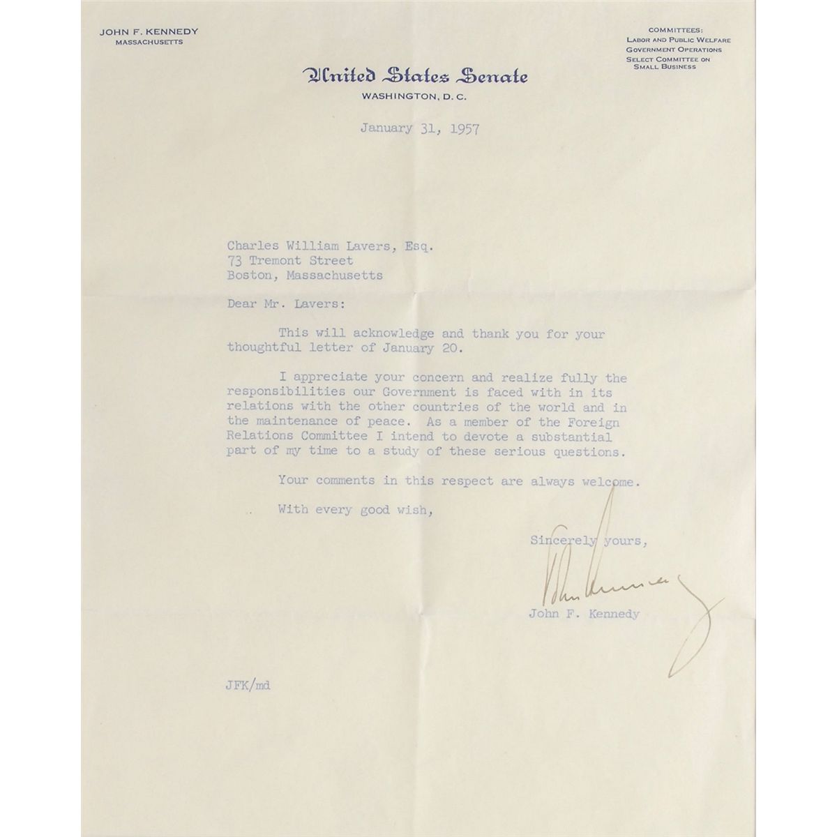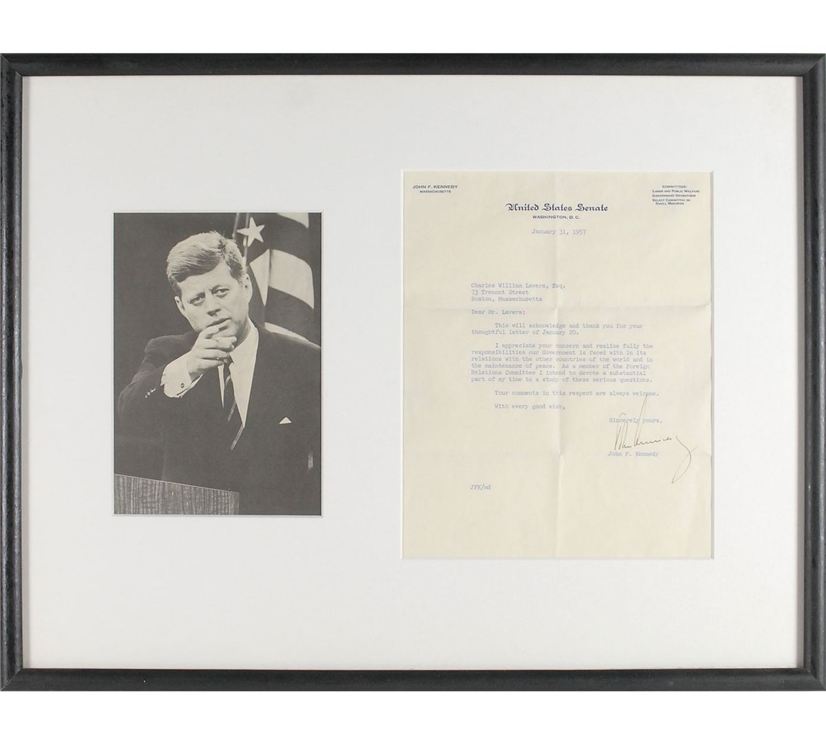 TLS signed “John Kennedy,” one page, 7.5 x 9.5, United States Senate letterhead, January 31, 1957. Letter to Charles William Lavers in Boston. In part: “I appreciate your concern and realize fully the responsibilities our Government is faced with in its relations with the other countries of the world and in the maintenance of peace. As a member of the Foreign Relations Committee I intend to devote a substantial part of my time to a study of these serious questions.” Matted and framed with a portrait of Kennedy to an overall size of 20.5 x 16. In fine condition, with intersecting folds.
