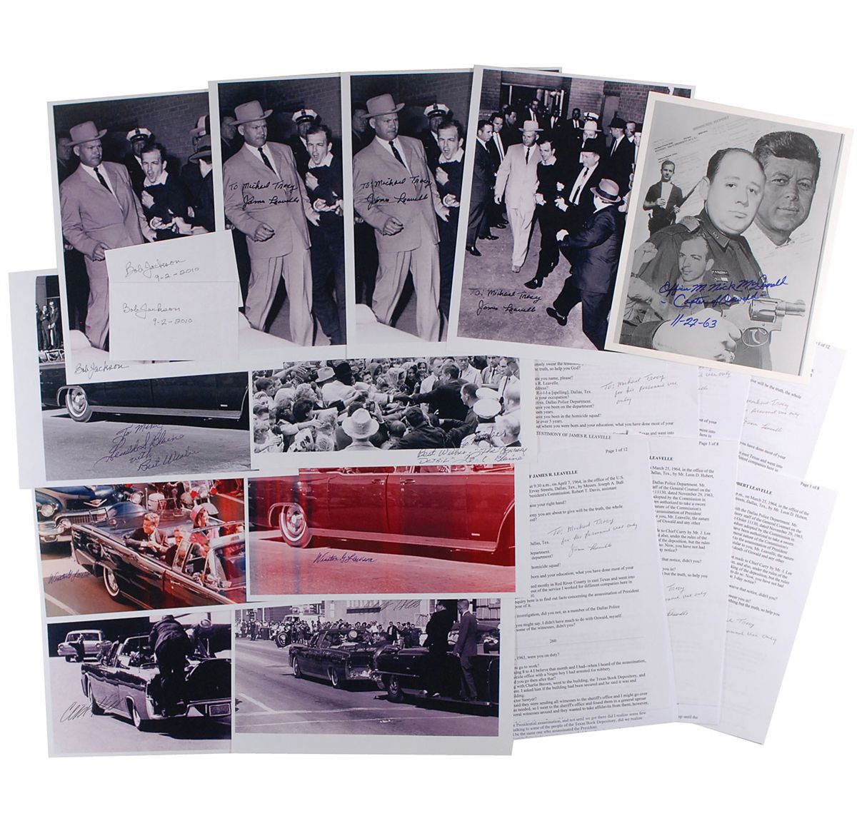 Collection of 19 items consisting of signed photos and printed testimonies, each signed by a person associated with the Kennedy assassination. Signers are: M. Nick McDonald (SP), Winston Lawson (2 SP), Clint Hill (2 SP), James Leavelle (9; 2 SP and 7 printed testimonies, all inscribed), Gerald Blaine (2 SP ins), and Bob Jackson (3; one photo and two signatures). In fine condition.