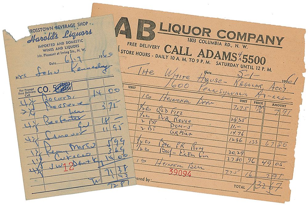 Also included are two receipts for alcohol purchased by Mrs. Kennedy (with neither listing the bottle offered here), one while her husband was campaigning for the presidency, dated June 17, 1960; and a later one while president, delivered to “The White House 1600 Pennsylvania Avenue,” dated May 1, 1961.