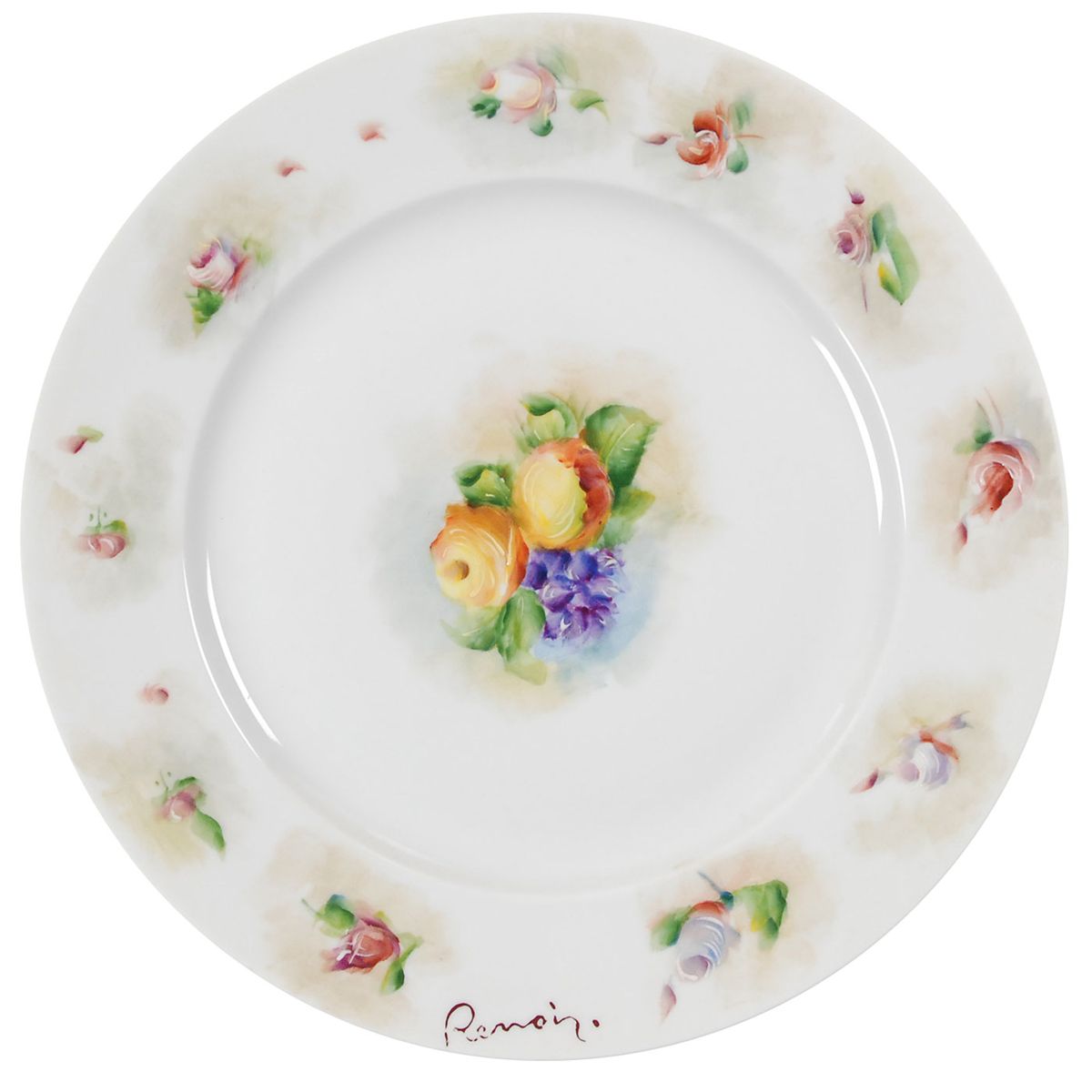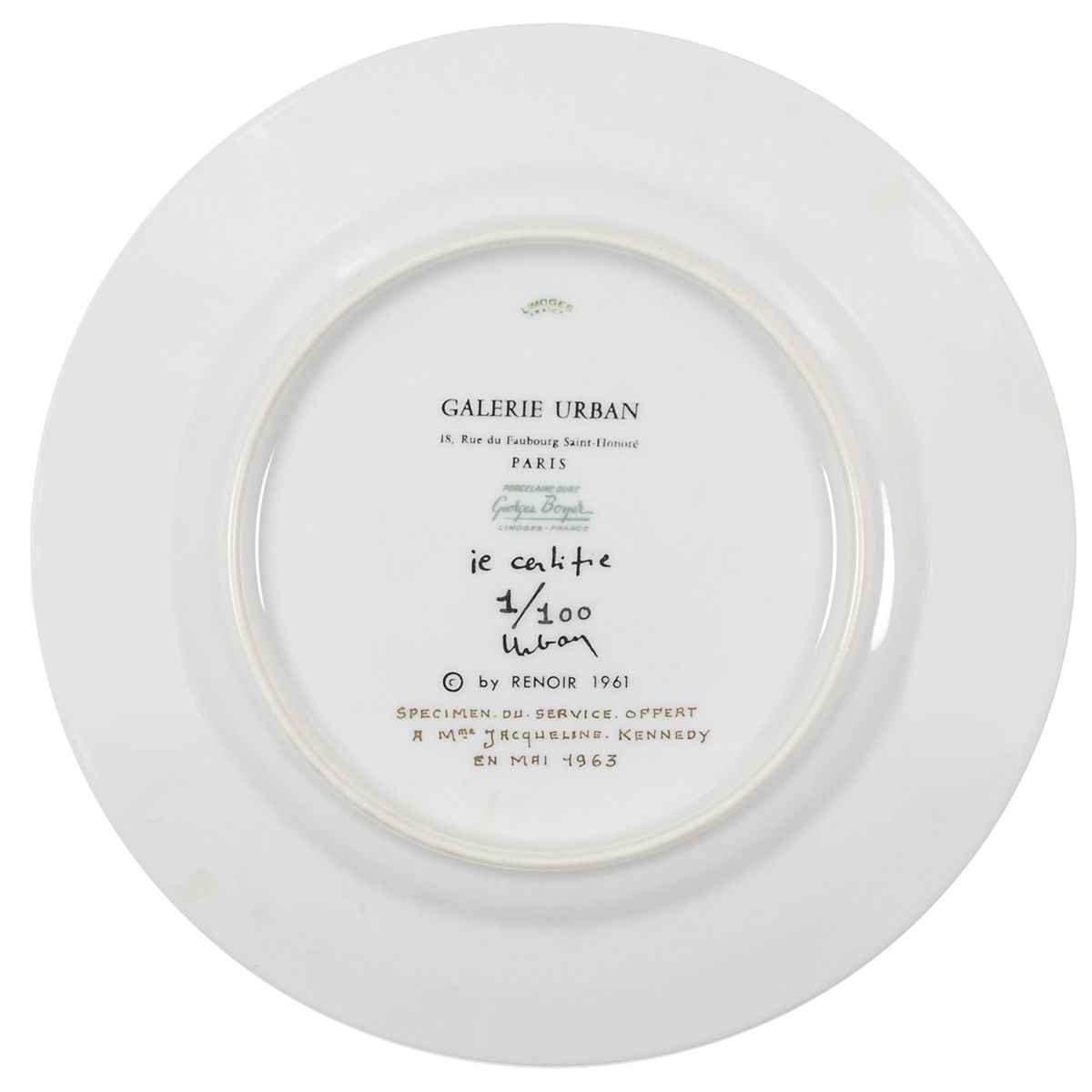 Beautiful limited edition hand-painted Limoges porcelain dinner plate as approved by Jacqueline Kennedy for the First Couple’s visit to Paris in May 1963, numbered 1/100, measuring 9.5? in diameter, featuring stunning floral designs in the center and edges based upon the work of renowned Parisian artist Auguste Rodin. The bottom of the plate bears a hand-painted note in gold, “Specimen du service offert a Mme. Jacqueline Kennedy in Mai 1963 [Example of the service offered to Mrs. Jacqueline Kennedy in May 1963],” with makers’ stamps of Georges Boyer of Limoges and Galerie Urban. In fine condition. Stunning sets of Rodin-inspired china were prepared in anticipation of the Kennedys’ visit, with 100 of these ‘specimen’ example plates being produced in addition to the gifts given to the couple. Three such examples were submitted to Jacqueline for approval beforehand. These were to be marketed by the Galerie Urban in London, and were not produced for the general public. This rare and exquisitely decorated piece of china is a fantastic representation of the first lady’s influential style and artistic taste.