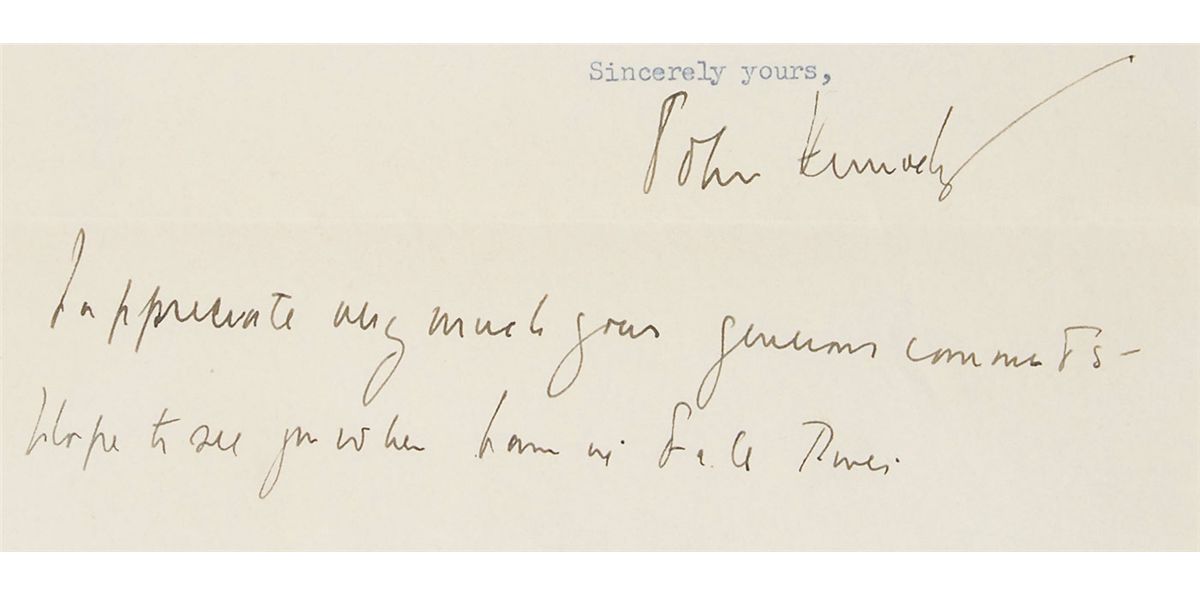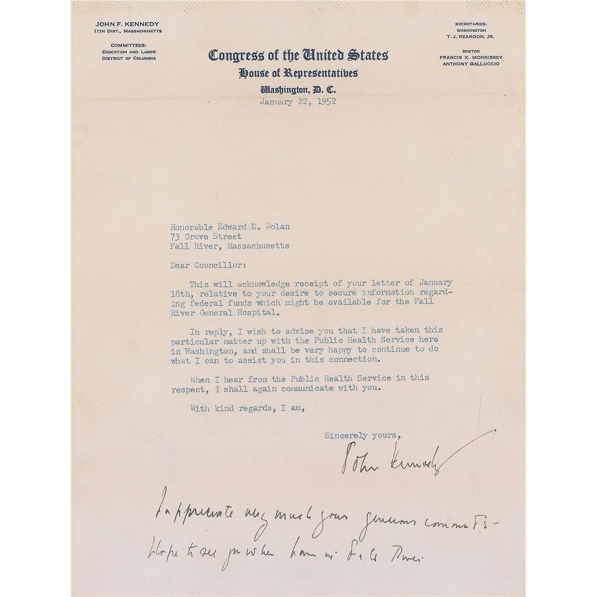 TLS signed “John Kennedy,” one page, 8 x 10.5, Congress of the United States, House of Representatives letterhead, January 22, 1952. Letter to Edward Dolan of Fall River, Massachusetts. In part: “This will acknowledge receipt of your letter of January 18th, relative to your desire to secure information regarding federal funds which might be available for the Fall River General Hospital…I have taken this particular matter up with the Public Health Service here in Washington, and shall be very happy to continue to do what I can to assist you in this connection. When I hear from the Public Health Service in this respect, I shall again communicate with you.” Kennedy pens a brief postscript at the conclusion, in full: “I appreciate very much your generous comments—I hope to see you when I am in Fall River.” In fine condition. Accompanied by the original mailing envelope. At this time, Kennedy was amidst his ambitious campaign to unseat Henry Cabot Lodge, Jr., in the Senate. Utilizing his brother Robert F. Kennedy as his campaign manager, JFK’s vigorous effort included visiting every city, town, and village in Massachusetts at least once—Fall River among them.