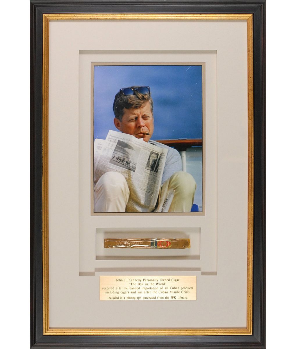 Unopened cigar, 5.25? long, presented to President Kennedy by Philippine Ambassador Amelito Mutuc. Cigar label reads, “Flor Fina Coronas Alhambra Manila,” on a red and gold label with a black band imprinted “Choicest Philippine Tobacco Sumatra Wrapper.” Printed in gold on the wrapper is: “Specially made for President Kennedy.” Nicely double-matted and framed with a color portrait of Kennedy on the water smoking a cigar, and a small plaque to an overall size of 14.5 x 21.5. In fine condition. Accompanied by copies of correspondence between Kennedy and Mutuc, in which the president sends thanks for the gift of “the fine cigars.” Kennedy’s affinity for cigars is well known, including ordering over 1000 Cuban cigars the day before imposing the country’s trade embargo with Cuba in 1962, a ban which still exists today.