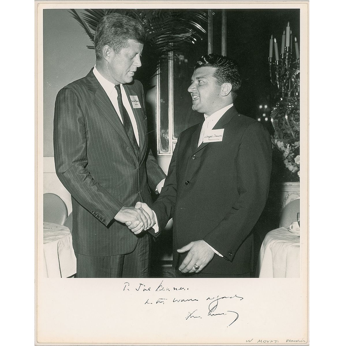 Vintage matte-finish 11 x 13.75 photo of Kennedy shaking hands with Joe Venneri at a function, with both gentlemen wearing name tags, signed and inscribed in the lower border in black ink, “To Joe Venneri, with warm regards, John F. Kennedy.” Photo is affixed to a slightly larger mount, with some light edge and corner creases and some scattered irregular ink adhesion to a few portions of signature and inscription, and small pencil notation along bottom edge, otherwise fine condition. Accompanied by a full letter of authenticity from PSA/DNA. Venneri was a member of the musical group The Tokens, best known for their 1961 chart-topping single ‘The Lion Sleeps Tonight.’ A fabulous oversized photo with unique musical association.