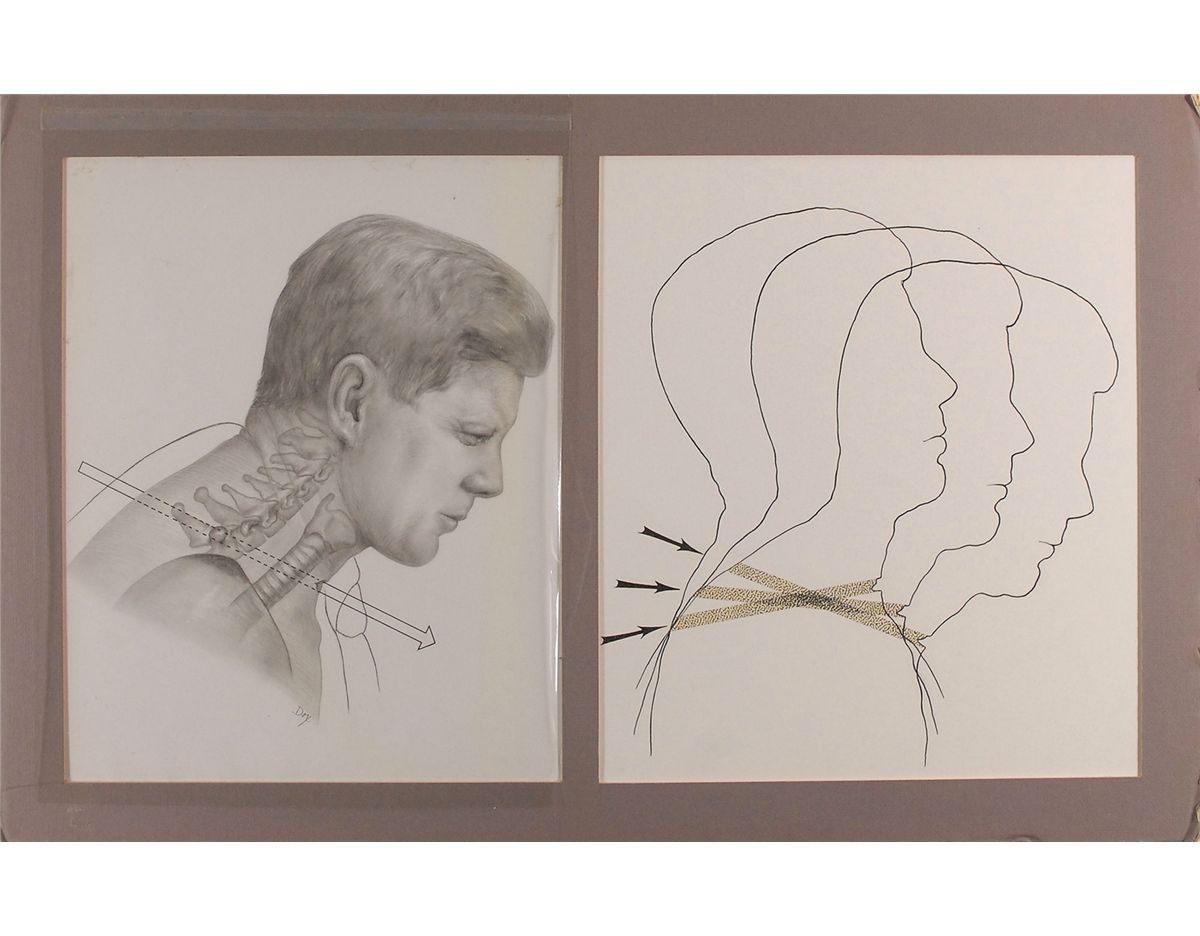 A pair of original and deeply revealing medical illustrations, each 10 x 12.5, done in ink, gray wash, and tape, for the 1978 hearings on the murder of John F. Kennedy by the House Select Committee on Assassinations. Illustrating the trajectory of the first bullet against profiles of the President's head and shoulders, both drawings were rendered by medical illustrator Ida G. Dox of Bethesda Maryland, who has signed one of the drawings, “Dox.” Drawings are housed in a 25 x 15.5 mat bearing her credit on the reverse, and both are covered by a sheet of heavy art paper bearing a stamped note: "DO NOT TOUCH SURFACE OF DRAWING."