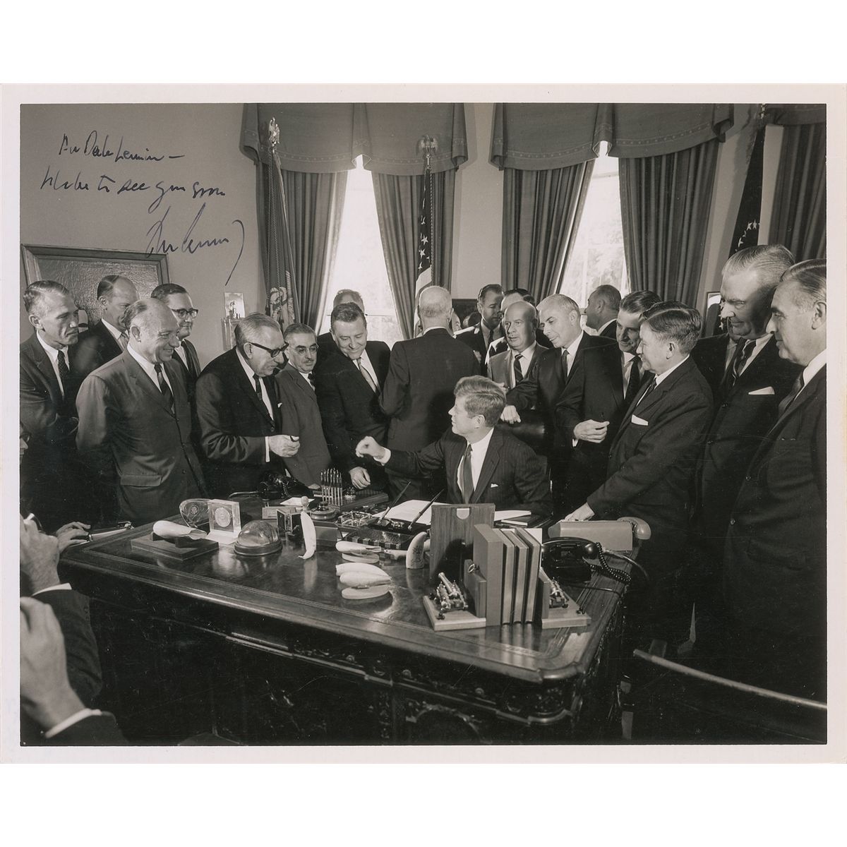 Vintage glossy 10 x 8 press photo of Kennedy at his desk in the Oval Office, ceremonial pens at his side, surrounded by a throng of politicians, signed and inscribed in fountain pen as president, “For Dale Levinson—I hope to see you soon, John Kennedy.” In fine condition. This photo was taken on September 24, 1963, as Kennedy was signing a bill to aid medical education. A wonderful photo that captures the essence of the office of the president, as Kennedy signs a bill into law with those who shaped it standing by with pride.