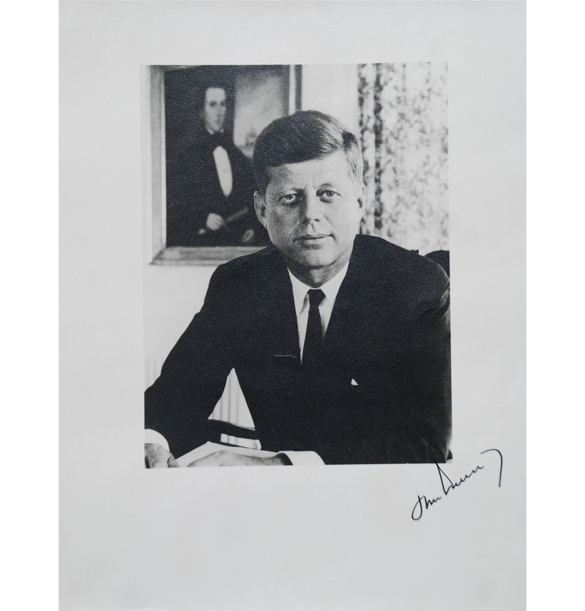 KENNEDY, JOHN F., 35th President of the U.S. SP, matte finish, image 6 ½ x 5, overall 10 x 8 including border on which Kennedy has signed. This picture was given to the son-in-law of the President of Colombia when Kennedy visited Bogota in December of 1961.Great Item!