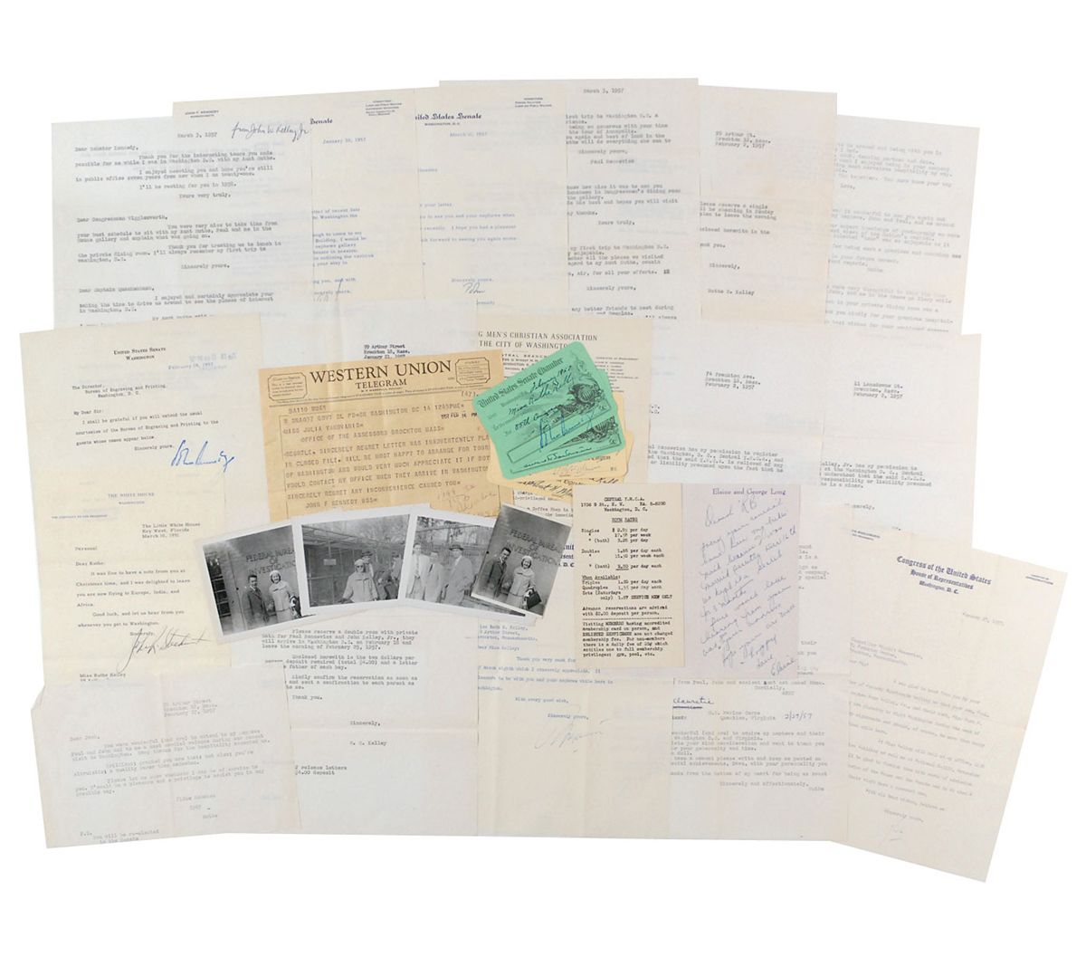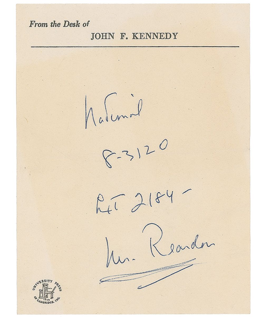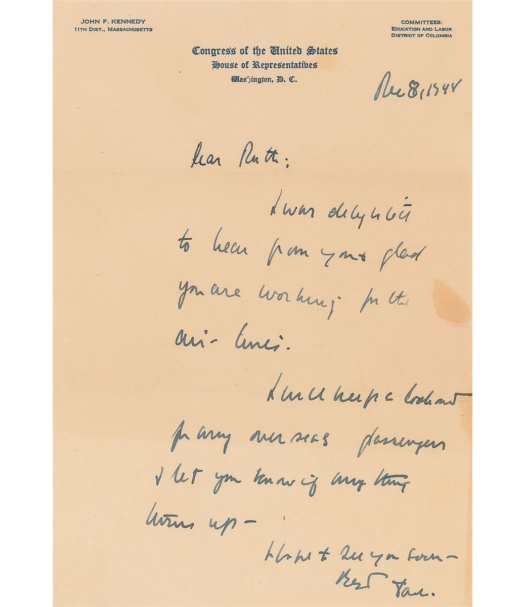 Scarce ALS signed “Jack,” one page, 4.25 x 9, Congress of the United States letterhead, December 8, 1948. Letter to Ruthe Kelley, who carried on a lengthy correspondence with JFK and his aides during his time in Washington. In full: “I was delighted to hear from you & glad you are working for the air-lines. I will keep a lookout for any overseas passengers & let you know if any thing turns up.” Also includes a handwritten note by Kennedy on a 4 x 5 sheet headed “From the desk of John F. Kennedy,” in full: “National, 8-3120, Ext 2184—Mr. Reardon.” Some staining to the right side of the letter, otherwise fine condition. Accompanied by several secretarially signed letters from JFK’s office as well as carbon copies of Ruthe’s letters to JFK and other notable figures. Ruthe, a Massachusetts resident, originally met Kennedy at a fashion show in the late 1940s and visited him in Hyannis Port and in Washington; in one of her letters she recalls a time when JFK told her that he did not know how to swim, so she visited him in Hyannis to teach him only to find that he was in truth an excellent swimmer. A charming collection of letters.