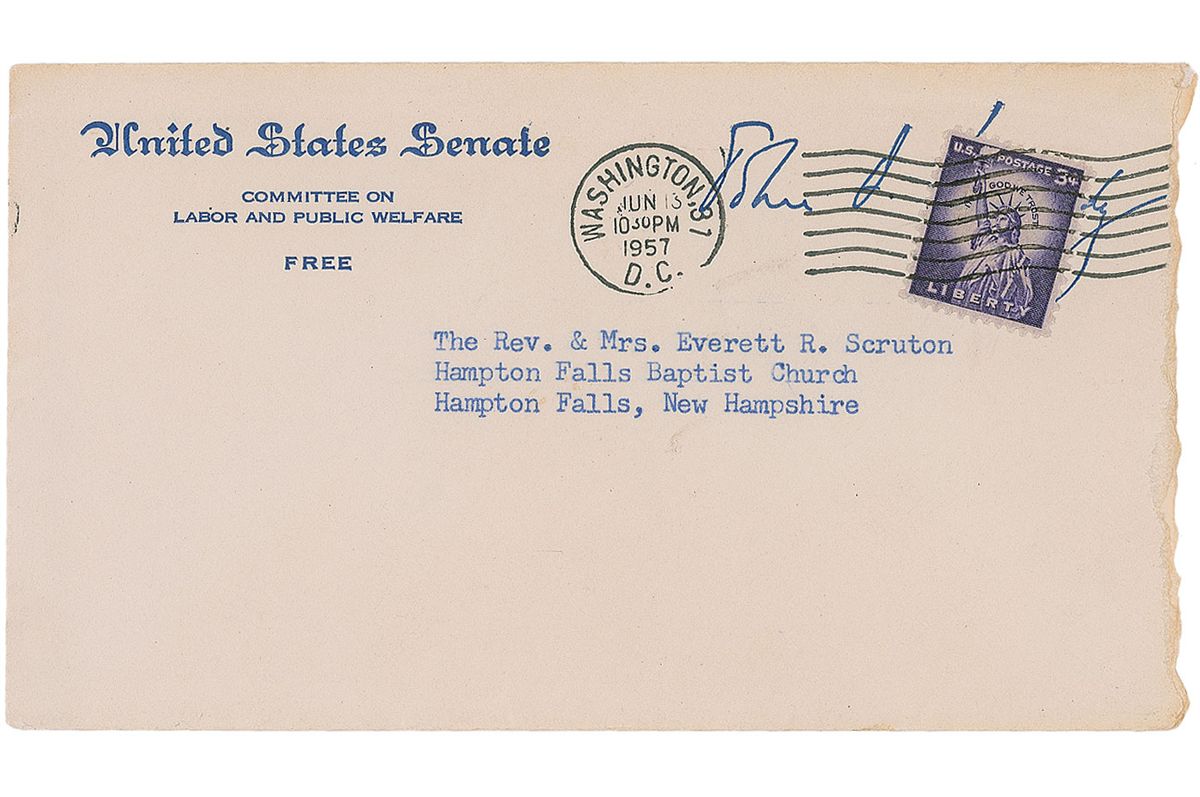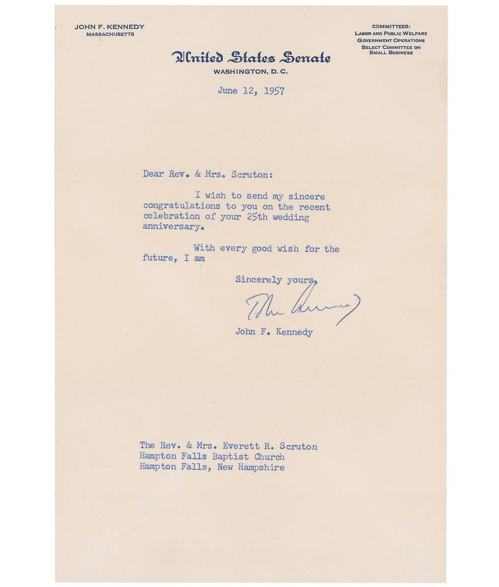 Uncommon TLS, one page, 6.25 x 9.25, United States Senate letterhead, June 12, 1957. Letter to Rev. and Mrs. Everett R. Scruton of Hampton Falls Baptist Church in New Hampshire. In part: “I wish to send my sincere congratulations to you on the recent celebration of your 25th wedding anniversary.” In fine condition. This was an eventful year for Kennedy as well, winning the Pulitzer Prize for Biography for Profiles in Courage and supporting the passage of President Eisenhower’s Civil Rights Act of 1957.