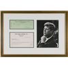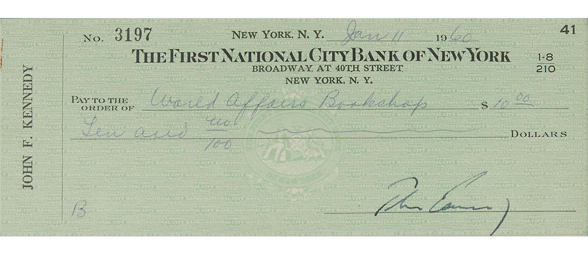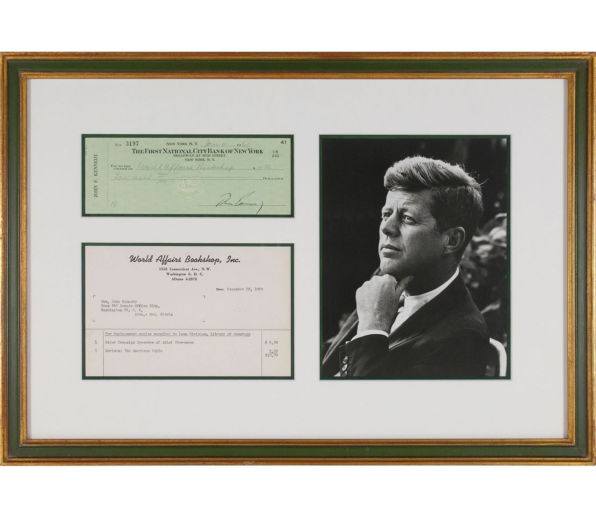 Personal check, 8 x 3, filled out in another hand and signed by Kennedy, “John Kennedy,” payable to World Affairs Bookshop for $10, January 11, 1960. Beautifully double-matted and framed with the original invoice and a portrait of Kennedy to an overall size of 23 x 16. In fine condition. The invoice from Washington’s World Affairs Bookshop is unsigned and addressed to Kennedy’s Senate office, 8 x 5, December 28, 1959, headed: “Replacement copies supplied to Loan Division, Library of Congress.” It lists two books, “Major Campaign Speeches of Adlai Stevenson” and “Morison: The American Style,” at five dollars apiece.